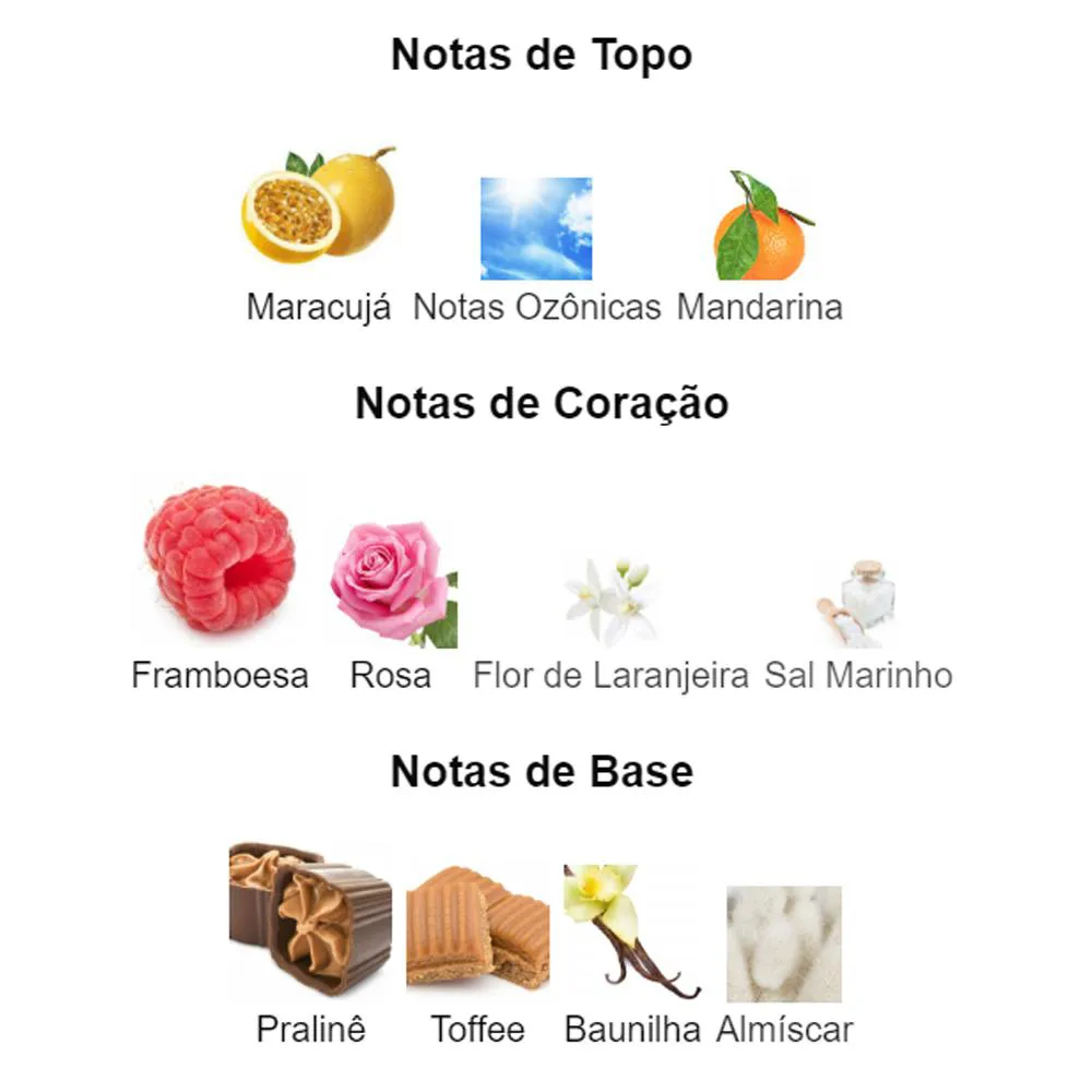 Notas de Coração: Framboesa, Rosa, Flor de Laranjeira e Sal Marinho.