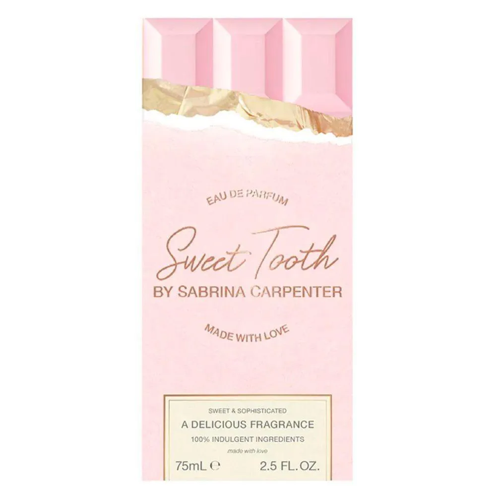 Perfume Sweet Tooth by Sabrina Carpenter Eau de Parfum Feminino 75 ml é uma fragrância açucarada e encantadora, criada para quem celebra leveza e doçura com estilo. Em um frasco divertido que lembra uma barra de chocolate rosa, ele transporta você para um universo de conforto gourmand, ideal para quem quer brilhar com doçura.A abertura é uma explosão de marshmallow, chocolate e gengibre cristalizado que se mistura ao frescor sutil da bergamota. Essa combinação abre o caminho com um toque doce, quente e acolhedor, que chama atenção com sua originalidade.No coração, a suavidade floresce com baunilha de Madagascar, leite de coco cremoso e jasmim delicado ? equilibrando o viés doce com uma feminilidade floral, tornando a experiência ainda mais reconfortante e envolvente.A base final traz reinterpretações deliciosas de chantilly, açúcar, almíscar e madeiras suaves, que entregam um final macio, doce e sugerem aconchego. Sweet Tooth é perfeito para quem gosta de fragrâncias que abraçam como um abraço açucarado e deixam um rastro alegre por onde passam.Notas Olfativas:Notas de Topo: Marshmellow, Chocolate, Gengibre Cristalizado e Bergamota.Notas de Coração: Baunilha de Madagascar, Leite de Coco e Jasmim.Notas de Fundo: Chantilly, Açúcar, Almíscar e Madeira de Cashmere.*Imagens Meramente Ilustrativas.*As cores do produto podem variar de acordo com o monitor, a iluminação do ambiente e a sua percepção visual.*Verifique nossas políticas internas para que não haja nenhuma dúvida no processo de entrega ao finalizar a compra.
