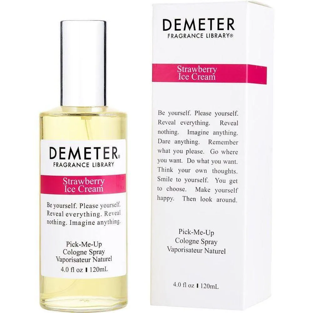 É um perfume unissex da marca Demeter Fragrance Library com fragrância que evoca o aroma de sorvete de morango. O produto serve para proporcionar uma experiência olfativa única, permitindo que o usuário se expresse através de uma fragrância doce e divertida, que remete a memórias afetivas de infância e momentos prazerosos, além de funcionar como um acessório de estilo pessoal que pode aumentar a autoconfiança e deixar uma marca olfativa característica.