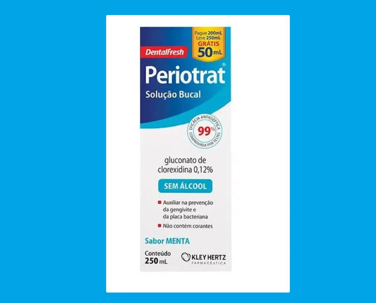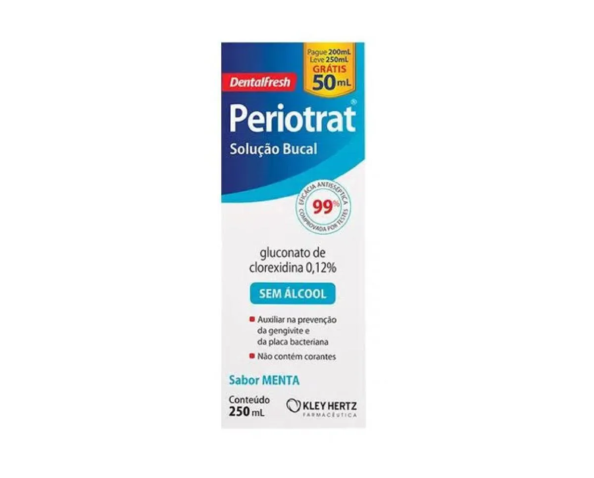 Periotrat Sem Álcool Sabor Menta 250ml - Kley Hertzenxaguante bucal Periotrat Menta 250ml O Enxaguante Bucal Periotrat Menta 250ml é uma antisséptico que trata a placa bacteriana de maneira eficiente. Com 99,6% de eficácia, esta solução bucal ajuda na prevenção de gengivite, eliminando micro-organismos que causam o mau hálito. Sua fórmula possui Gluconato de Clorexidina, um agente químico com ação antimicrobiana de efetividade comprovada. Além disso, garante um hálito gostoso, pois, tem o sabor refrescante de menta.Como Usar: Enxágue a solução, sem diluir, por 30 a 45 segundos pela manhã e à noite.