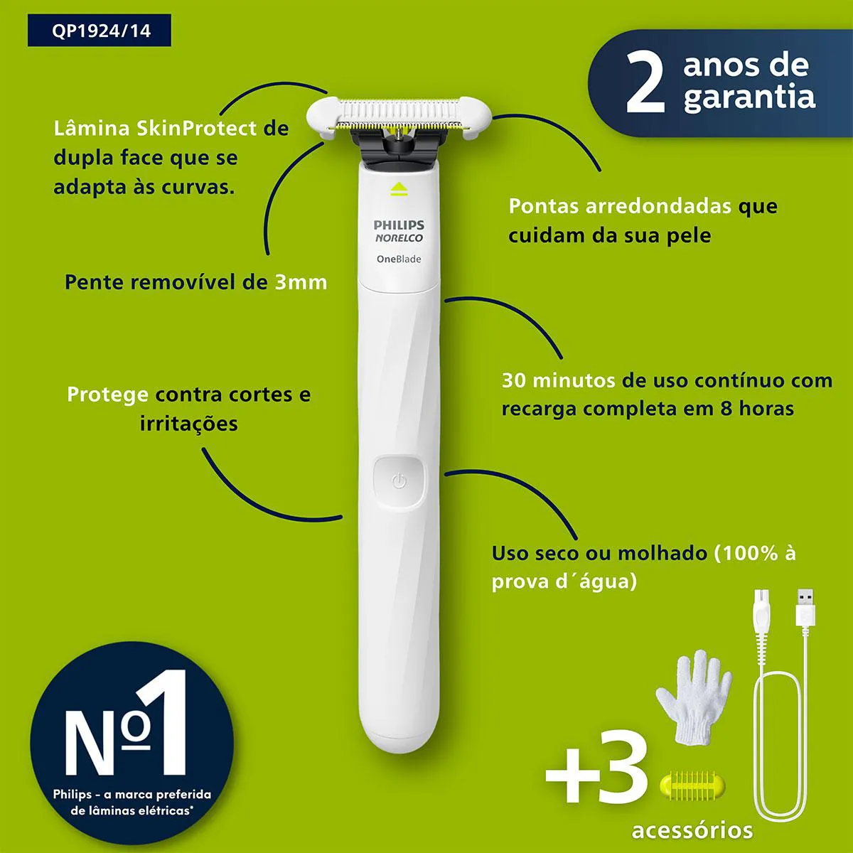 - Tecnologia OneBlade: lâmina SkinProtect de dupla face que garante precisão e suavidade durante o uso.
