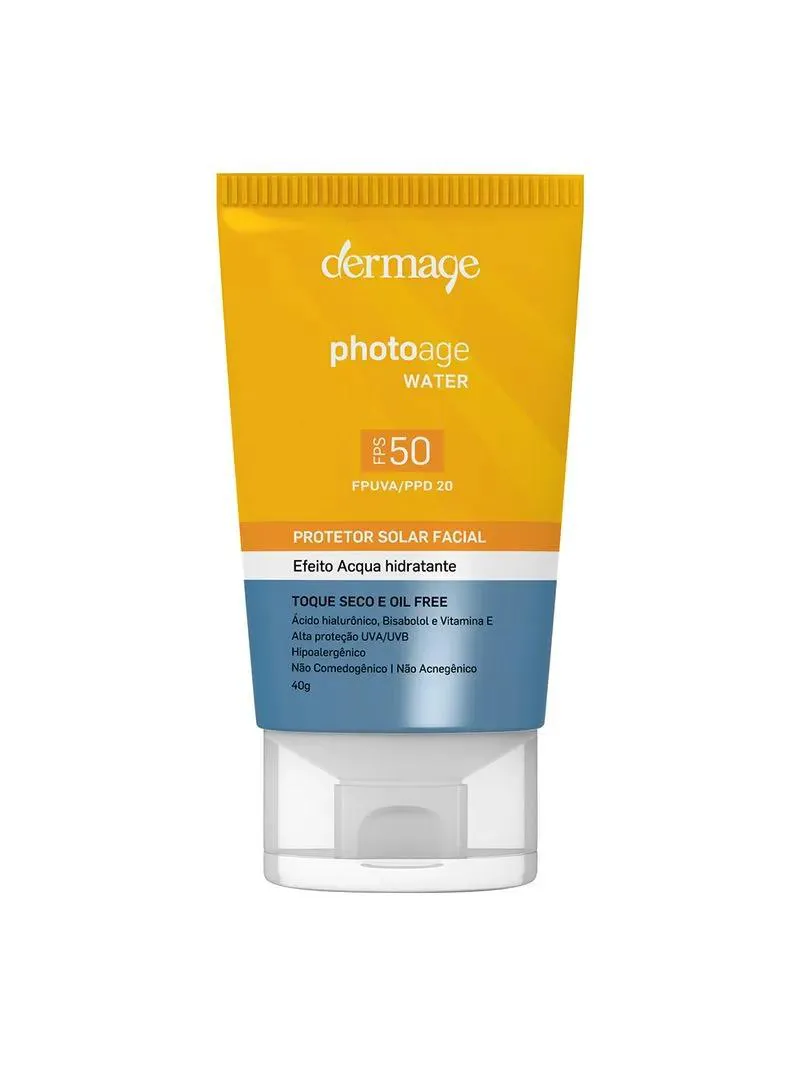 Photoage Water Dermage FPS 50 - 40gO Photoage Water FPS 50 da Dermage é um protetor solar facial com textura ultraleve, toque seco e rápida absorção. Ideal para todos os tipos de pele, inclusive as oleosas, oferece alta proteção contra os raios UVA e UVB, além de hidratar sem deixar a pele pegajosa. Sua fórmula oil-free é resistente à água e ao suor, garantindo proteção diária com conforto.Principais benefícios: