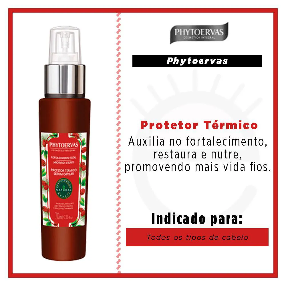 Phytoervas Protetor Térmico Fortalecimento Total foi desenvolvido especialmente para proteger os cabelos da ação térmica do secador, prancha e modelador, reforçando os cuidados iniciados com os outros produtos da linha Phytoervas Fortalecimento Total.