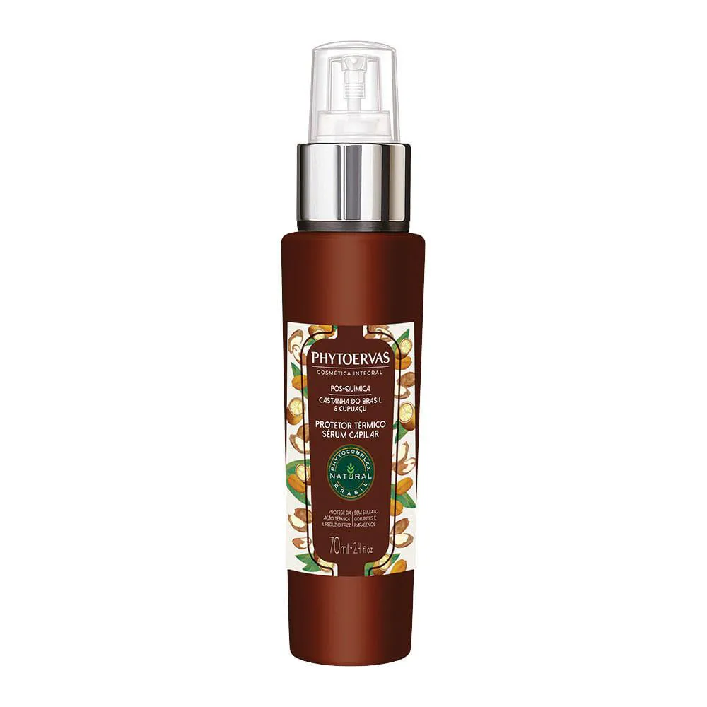 Phytoervas Protetor Térmico Sérum Capilar Tratamento Pós Química foi desenvolvido especialmente para proteger os cabelos da ação térmica do secador, prancha e modelador, reforçando os cuidados iniciados com os outros produtos da linha Phytoervas Tratamento Pós Química. Possui castanha do Brasil e cupuaçu, além de cisteína e ácidos graxos, ingredientes importantes que protegem os cabelos dos efeitos nocivos dos processos químicos e ainda auxiliam a reconstrução capilar.