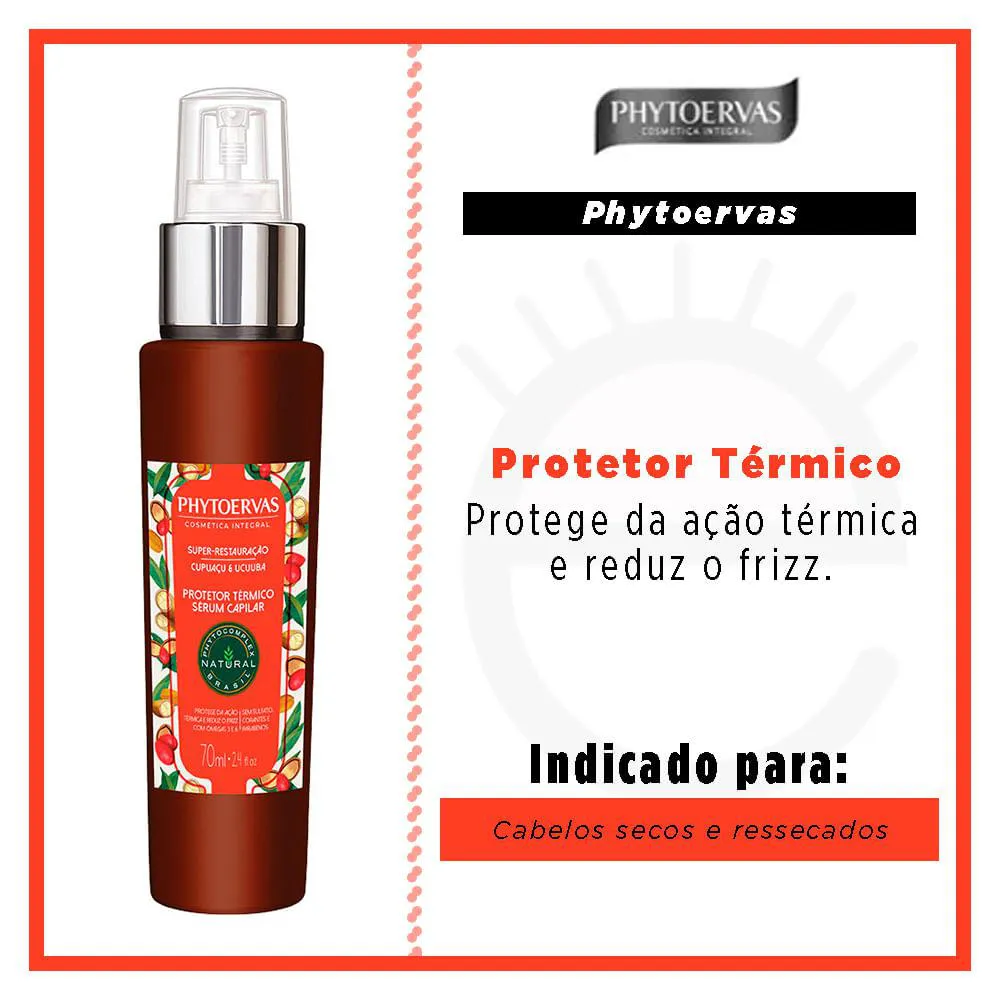 Phytoervas Protetor Térmico Sérum Capilar Super Restauração foi desenvolvido especialmente para proteger os cabelos da ação térmica do secador, prancha e modelador, reforçando os cuidados iniciados com os outros produtos da linha Phytoervas Super Restauração.