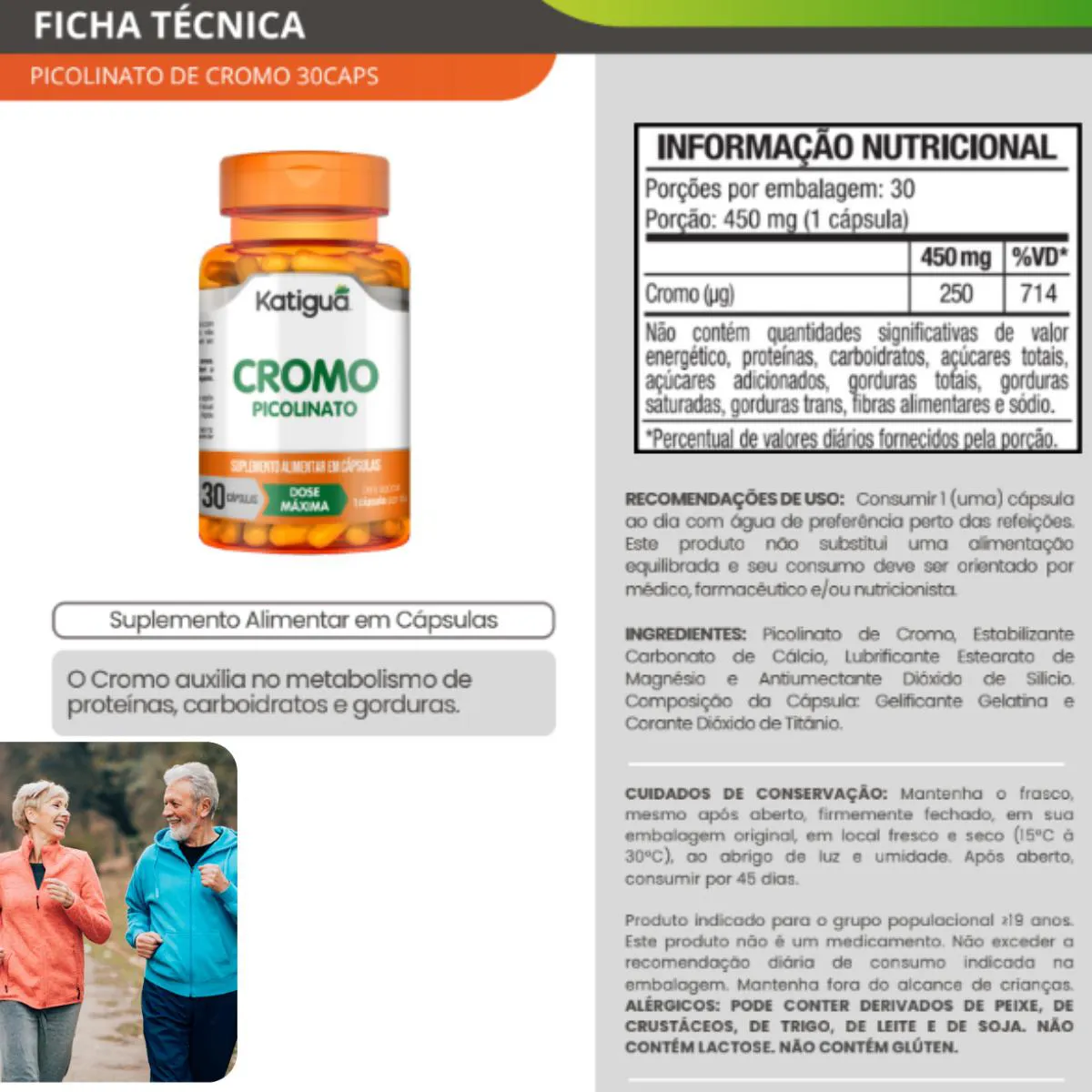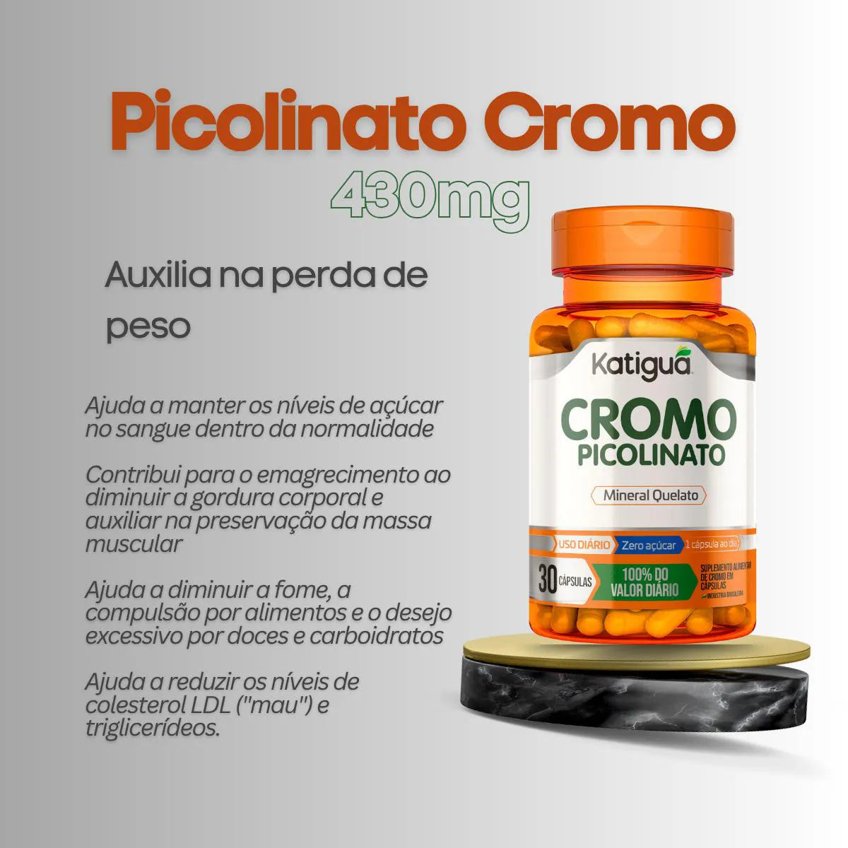 Suplemento mineral formulado com cromo, nutriente essencial para o metabolismo de proteínas, carboidratos e gorduras.Benefícios: