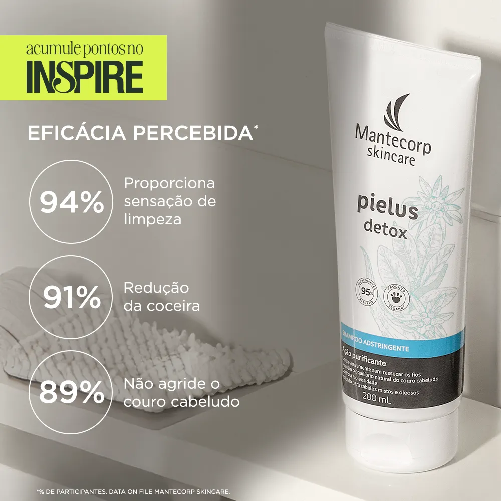 PIELUS DETOX POSSUI 95% DE INGREDIENTES NATURAIS E PROMOVE AÇÃO ADSTRINGENTE E PURIFICANTE COM TEXTURA LEVE E AÇÃO MICROESFOLIANTE.