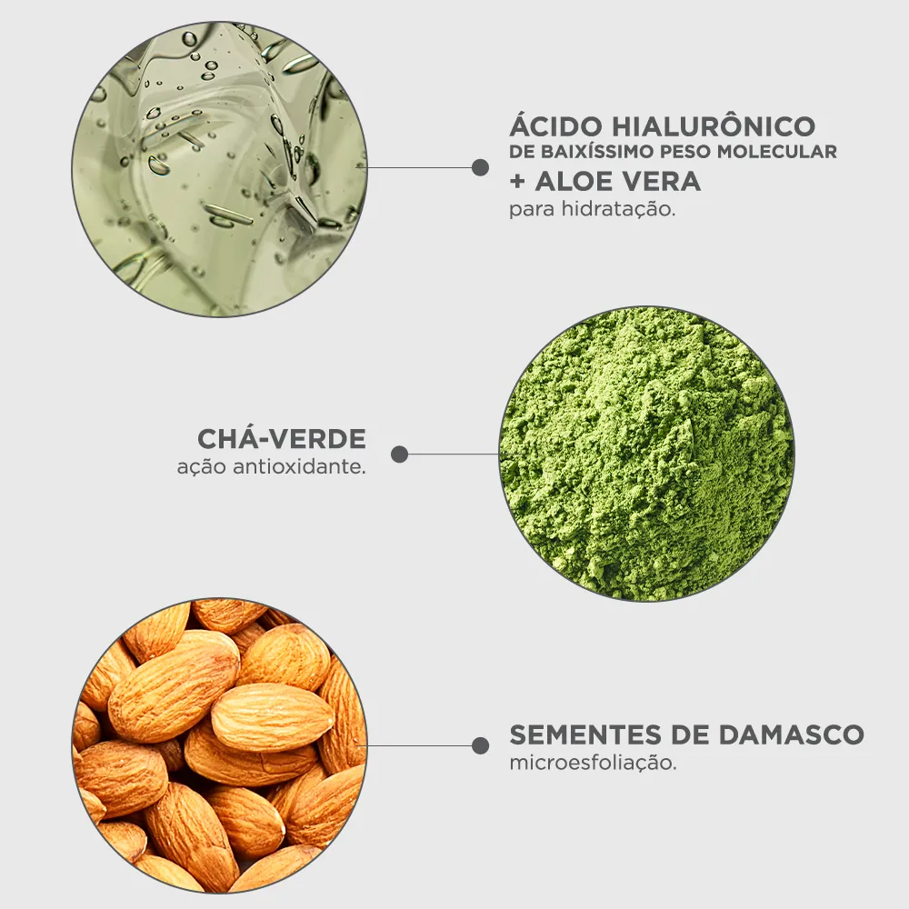 SUA FORMULAÇÃO EXCLUSIVA POSSUI ÁCIDO HIALURÔNICO, ALOE VERA, PREBIÓTICO NATURAL, SEMENTES DE DAMASCO E CHÁ-VERDE QUE PROMOVEM LIMPEZA PROFUNDA, CONTROLE DA OLEOSIDADE, EQUILÍBRIO DO MICROBIOMA, AÇÃO ANTIOXIDANTE, ALÉM DE REDUZ A COCEIRA, VERMELHIDÃO E DESCAMAÇÃO DO COURO CABELUDO, HIDRATAR E NÃO RESSECAR OS FIOS.