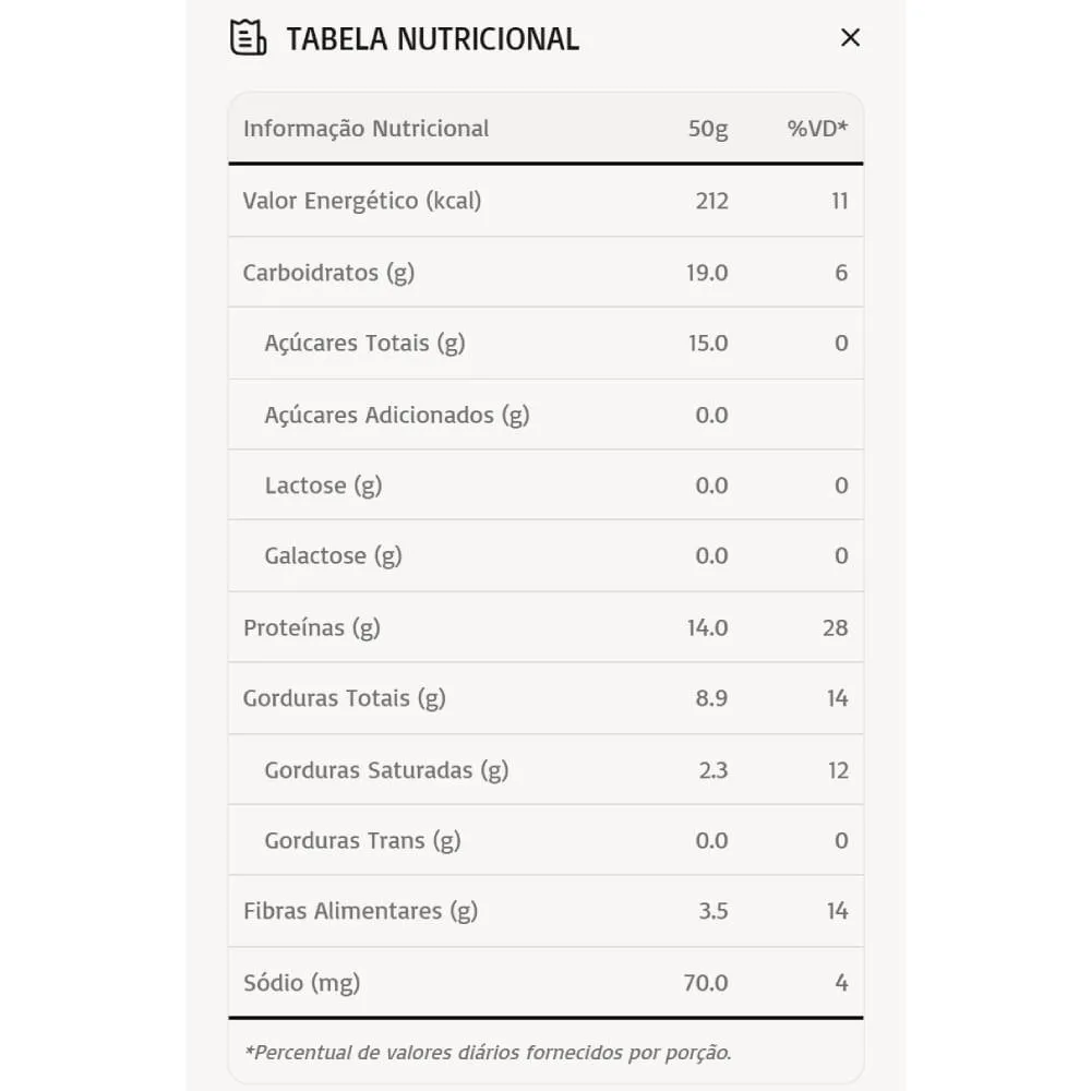 - Sem açúcar adicionado, glúten e lactose.