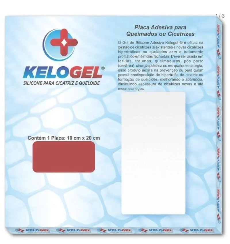 Descrição: O Gel de Silicone Adesivo Kelogel ®️ é eficaz no gerenciamento de cicatrizes, cicatrizes hipertróficas ou queloides com o tratamento profilático em feridas fechadas. Deve ser usada em feridas, traumas, queimaduras, pós-parto (cesárea), cirurgia plástica ou em qualquer cirurgia, esse produto auxilia na prevenção ou para quem possui predisposição de hipertrofia de cicatriz ou formação de queloides, melhorando a aparência, diminuindo espessura de cicatrizes novas e até mesmo antigas. Contraindicação: evite o uso do produto se for alérgico a borracha de silicone. NÃO USE em feridas que não foram curadas. Benefícios: • cicatrizes mais claras, menos avermelhadas e menos espessas. Modo de usar: Antes de manipular o produto fora da sua embalagem plástica, lave e higienize as mãos, e garanta que esteja livra de qualquer produto oleoso. Limpe e sanitize a pele a qual será aplicada, não usar pomada, creme ou algo oleoso no local secar e em seguida retirar a película protetora e aderir ao lado hidratante (colante) adesivo na região a ser tratada. Permanência de uso: usar de 8 a 12 horas (consulte seu médico) no período diurno ou noturno, com pausa de 2 a 4 horas entre os períodos de uso, ou sob orientação médica. Se estiver usando alguma pomada, usar no período de descanso, pois ela pode interferir no desempenho do produto, não usar a fita em pele molhada ou oleosa. Após a retirada da película protetora, a vida útil do gel em uso é de 2 a 4 semanas, conforme cuidado do produto, recomenda-se o uso do Gel de Silicone Adesivo Kelogel ®️ de 90 dias no mínimo, para um melhor resultado, aconselhamos 180 dias. Conservação: Lavar sempre que necessário com água morna e sabonete neutro, enxaguar com água morna e limpa, secagem natural a sombra por 4 horas. Recomenda-se o uso de modelador, cinta ou malha cirúrgica, ou algo que comprima o local, para que ela não escorregue, cobrir com micropore, para melhor fixação. REGISTRO ANVISA/ MS nº 81926090001.