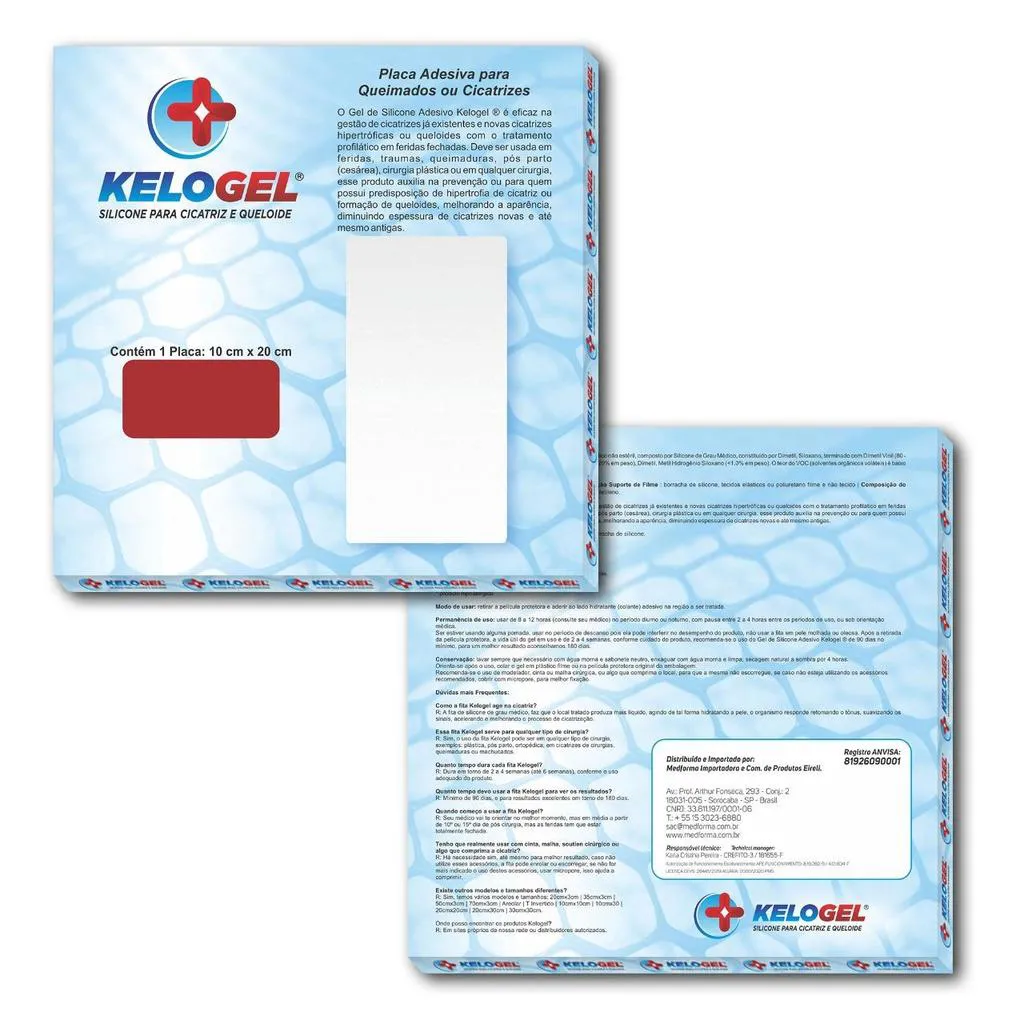 Indicação: O Gel de Silicone Adesivo Kelogel® é eficaz no tratamento de cicatrizes, cicatrizes hipertróficas e queloides em feridas fechadas. É indicado para uso em feridas, traumas, queimaduras, pós-parto (cesárea), cirurgias plásticas ou outras, auxiliando na prevenção de hipertrofia de cicatriz ou formação de queloides, melhorando a aparência e diminuindo a espessura de cicatrizes novas e antigas. Benefícios: Cicatrizes mais claras, menos avermelhadas e menos espessas. Contraindicação: Evite o uso do produto se for alérgico a borracha de silicone. Não use em feridas não cicatrizadas. Modo de usar: Higienize as mãos, certificando-se de que estejam livres de produtos oleosos. Limpe e sanitize a pele onde será aplicado, não use pomada, creme ou algo oleoso. Seque, retire a película protetora e aplique o lado colante na região. Use de 8 a 12 horas diurnas ou noturnas, com pausas de 2 a 4 horas entre os períodos de uso ou conforme orientação médica. Se estiver usando pomada, aplique durante o período de descanso, pois pode interferir no desempenho do produto. Após a retirada da película protetora, a vida útil do gel é de 2 a 4 semanas, dependendo dos cuidados. Recomenda-se o uso do Gel por no mínimo 90 dias, aconselhando-se 180 dias para melhores resultados. Conservação: Lave sempre que necessário com água morna e sabonete neutro, enxague com água morna, deixe secar naturalmente à sombra por 4 horas. Use modelador, cinta ou malha cirúrgica para comprimir o local e evitar que escorregue, cobrindo com micropore para melhor fixação. REGISTRO ANVISA/ MS nº 81926090001