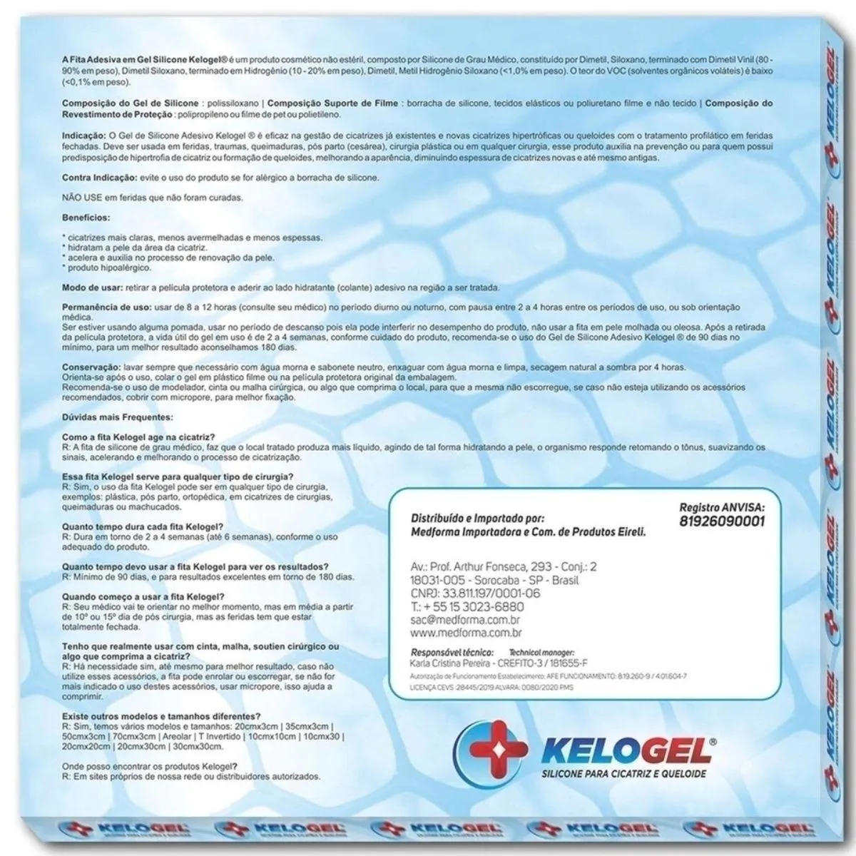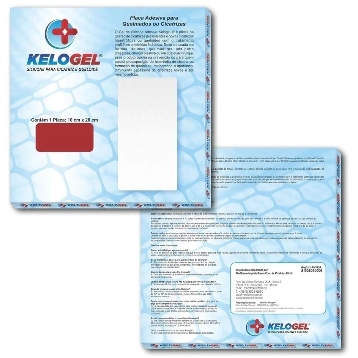 Descrição Indicação: O Gel de Silicone Adesivo Kelogel ®️ é eficaz no gerenciamento de cicatrizes, cicatrizes hipertróficas ou queloides com o tratamento profilático em feridas fechadas. Deve ser usada em feridas, traumas, queimaduras, pós-parto (cesárea), cirurgia plástica ou em qualquer cirurgia, esse produto auxilia na prevenção ou para quem possui predisposição de hipertrofia de cicatriz ou formação de queloides, melhorando a aparência, diminuindo espessura de cicatrizes novas e até mesmo antigas. Contraindicação: evite o uso do produto se for alérgico a borracha de silicone. NÃO USE em feridas que não foram curadas. Benefícios: • cicatrizes mais claras, menos avermelhadas e menos espessas. Modo de usar: Antes de manipular o produto fora da sua embalagem plástica, lave e higienize as mãos, e garanta que esteja livra de qualquer produto oleoso. Limpe e sanitize a pele a qual será aplicada, não usar pomada, creme ou algo oleoso no local secar e em seguida retirar a película protetora e aderir ao lado hidratante (colante) adesivo na região a ser tratada. Permanência de uso: usar de 8 a 12 horas (consulte seu médico) no período diurno ou noturno, com pausa de 2 a 4 horas entre os períodos de uso, ou sob orientação médica. Se estiver usando alguma pomada, usar no período de descanso, pois ela pode interferir no desempenho do produto, não usar a fita em pele molhada ou oleosa. Após a retirada da película protetora, a vida útil do gel em uso é de 2 a 4 semanas, conforme cuidado do produto, recomenda-se o uso do Gel de Silicone Adesivo Kelogel ®️ de 90 dias no mínimo, para um melhor resultado, aconselhamos 180 dias. Conservação: Lavar sempre que necessário com água morna e sabonete neutro, enxaguar com água morna e limpa, secagem natural a sombra por 4 horas. Recomenda-se o uso de modelador, cinta ou malha cirúrgica, ou algo que comprima o local, para que ela não escorregue, cobrir com micropore, para melhor fixação. REGISTRO ANVISA/ MS nº 81926090001
