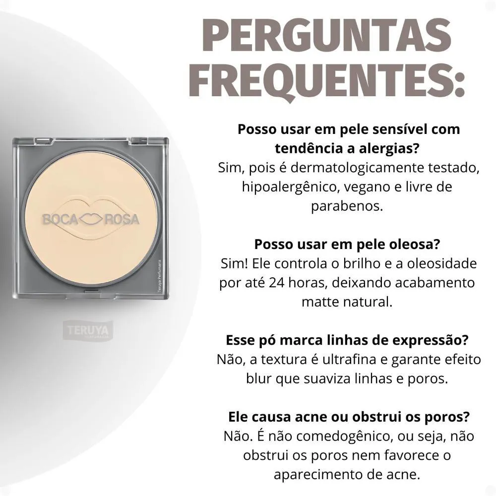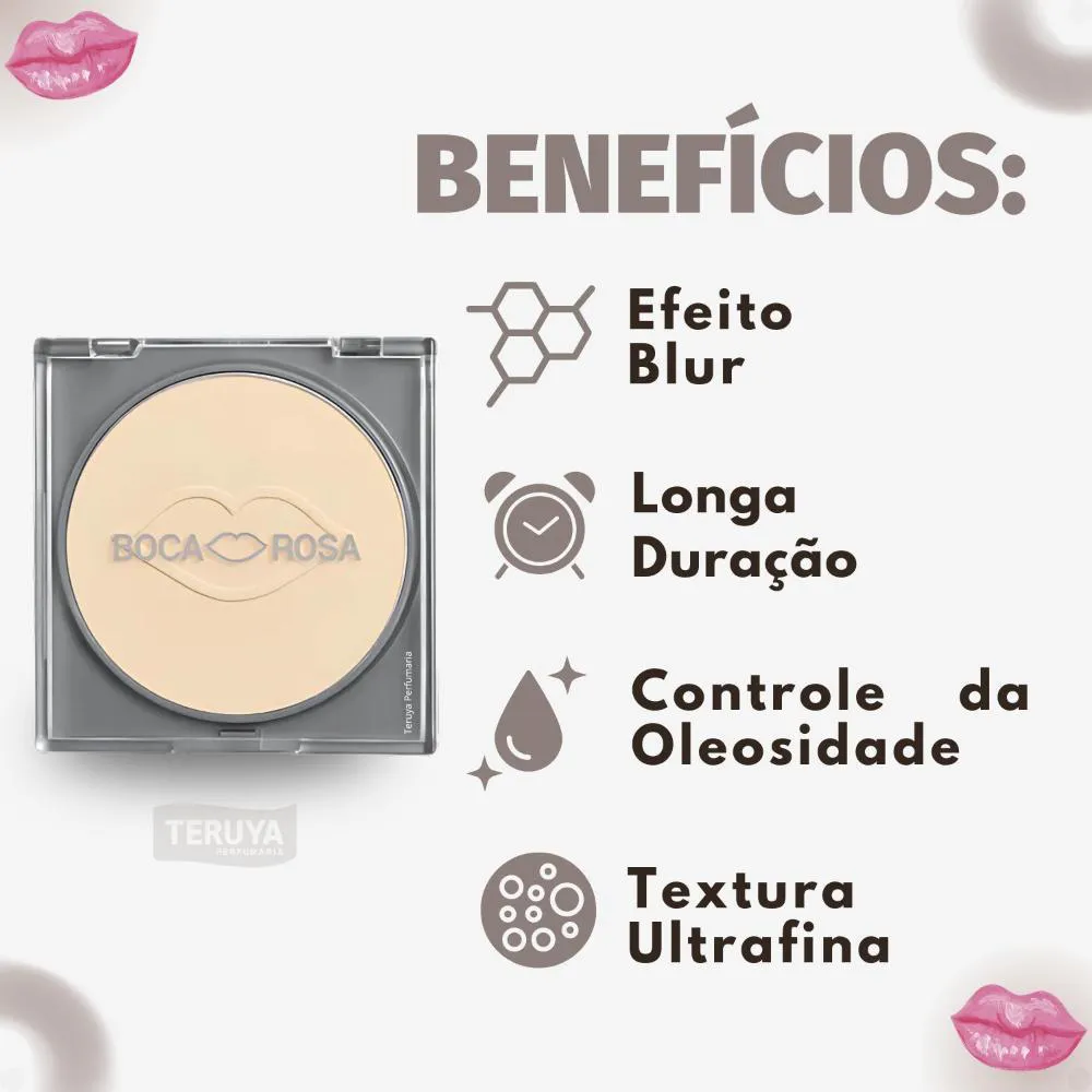 acabamento impecável e natural, adaptando-se a todos os tons de pele.Sela a maquiagem com uma textura ultrafina e leve, garantindo conforto.Oferece efeito blur e minimiza a aparência dos poros, deixando a pele suavizada.Ajuda a reduzir o brilho e a oleosidade, mantendo um efeito natural e iluminado.Garante