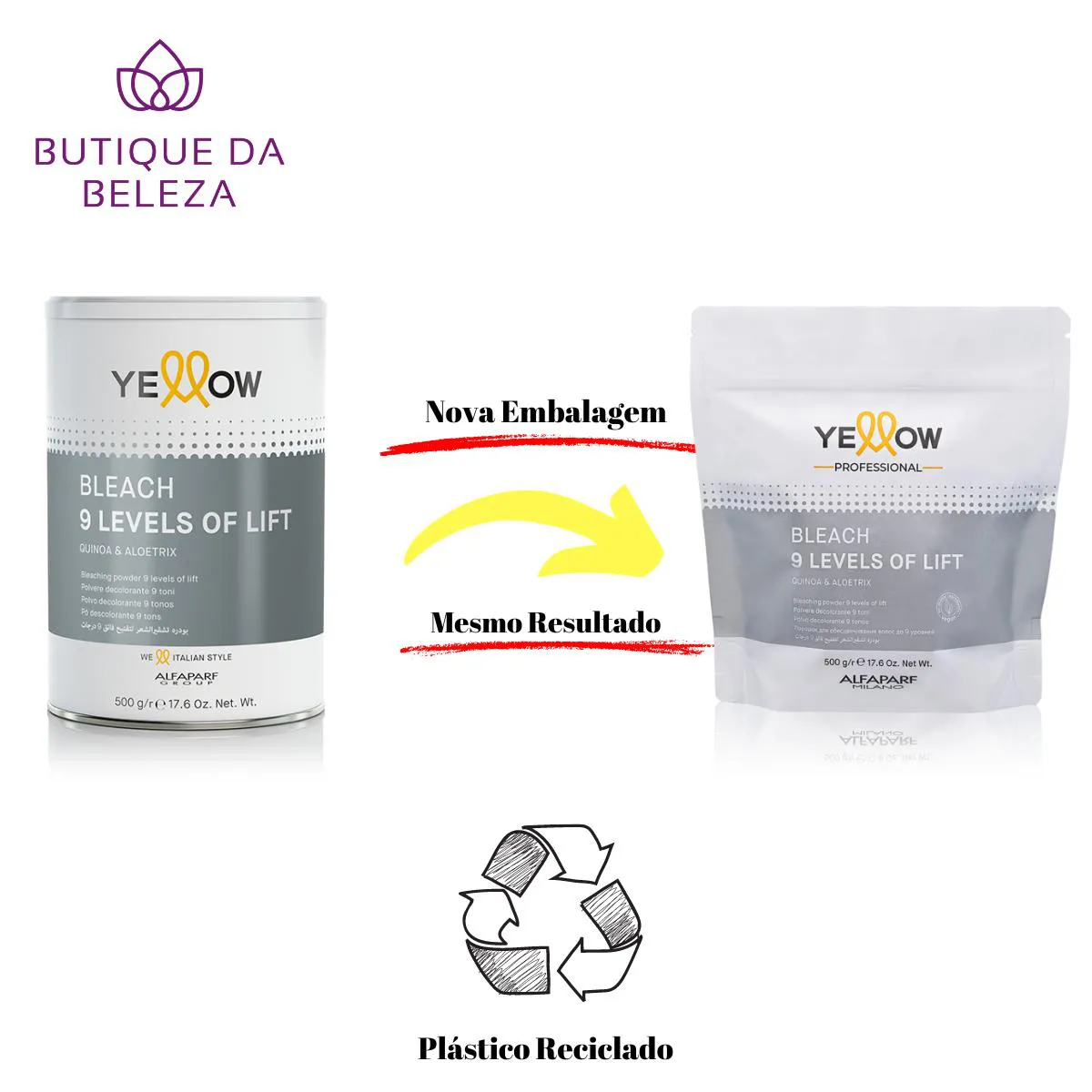 Somos a BUTIQUE DA beleza Uma empresa especializada no comércio de Cosméticos e Semijoias. Estamos sempre entre os Melhores Vendedores. NOSSO COMPROMISSO É COM VOCÊ! SEU CONFORTO E SEGURANÇA SÃO NOSSOS PROPÓSITOS SERVIR E AJUDAR SÃO NOSSOS DEVERES Pó Descolorante 9 Tons Bleach Yellow By Alfaparf 500 Gramas Textura Em Pó Não Volátil De Cor Branca, Para Facilitar A Leitura Do Fundo De Clareamento. Perfeito Para Todas As Técnicas De Clareamento. Modo De Uso Proporção De Mistura Bleach - Peroxide: De 1:1 A 1:3 De Acordo Com A Técnica De Descoloração Escolhida. Embalagem Pote com 500 Gramas.