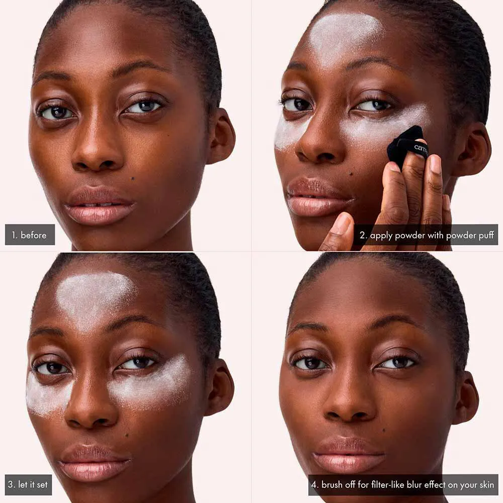 1. Com auxílio de um pincel fofo ou esponja seca, pegue uma pequena quantidade do Pó Solto Catrice Soft Blur Matte.