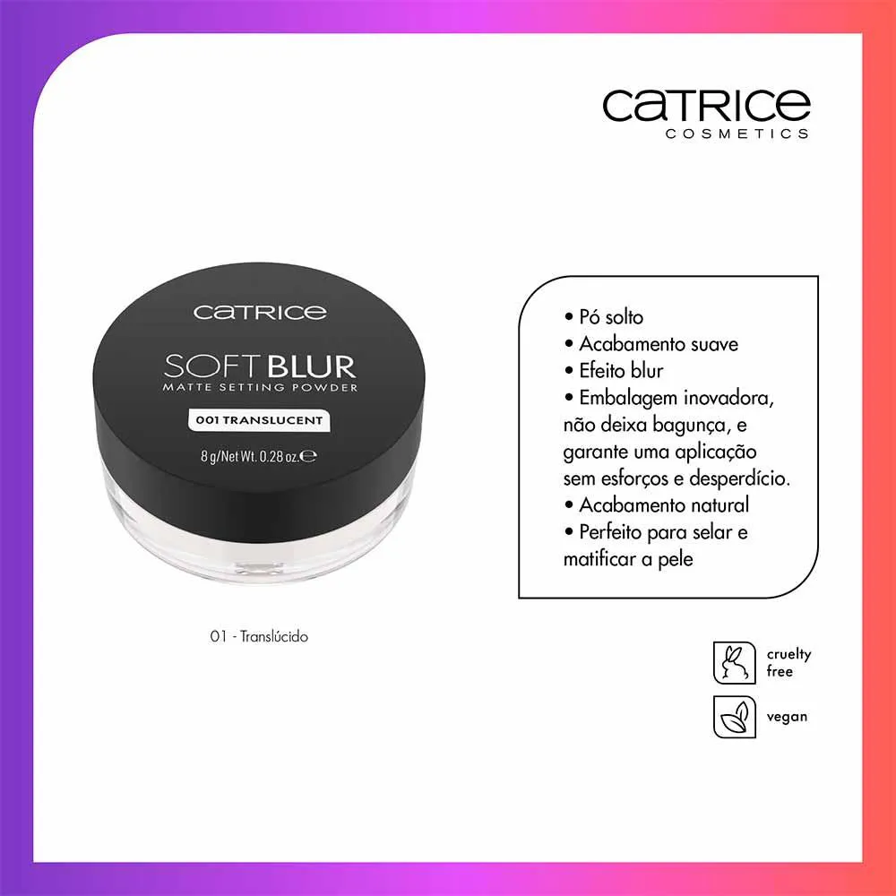 O Pó Solto Catrice Soft Blur Matte é um pó facial ultrafino, desenvolvido para finalizar a maquiagem com acabamento matte suave.