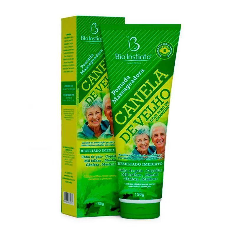 A pomada para canela de velho é um cosmético com ação desodorante e massageadora com sebo de carneiro. Em uma fórmula cosmética de rápida absorção, desenvolvida com 4 ervas naturais, dermatologicamente testada e aprovada, ela suaviza desconfortos musculares e oferece resultado imediato.