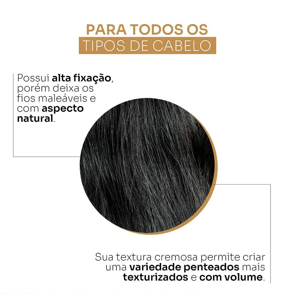 Possui alta fixação, porém deixa os fios maleáveis e com aspecto natural. Sua textura cremosa permite criar uma variedade penteados mais texturizados e com volume.