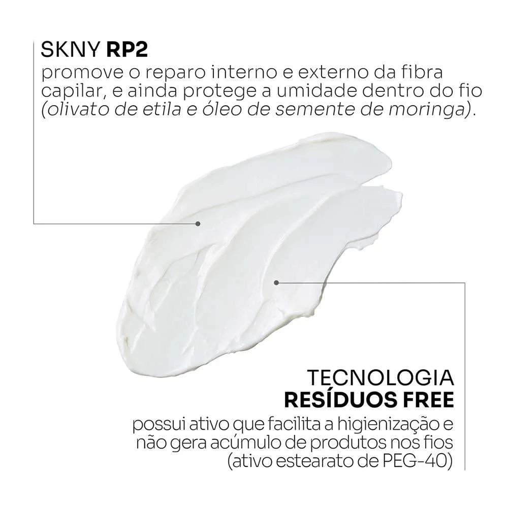 Sua fórmula possui proteção UV para proteger os fios dos efeitos nocivos do sol e também conta com a tecnologia SKNY RP2 que promove tratamento de reparação profunda interna e externa da fibra capilar.