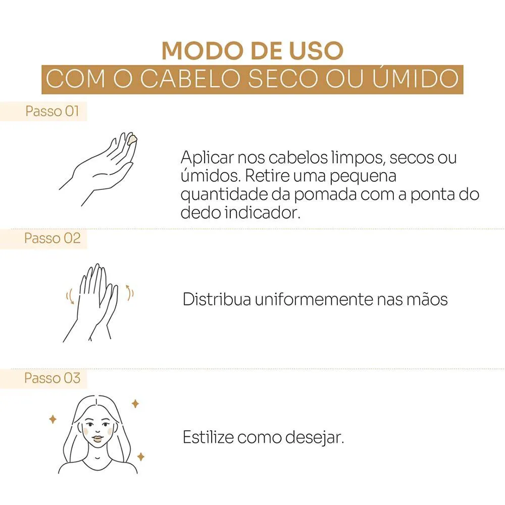1 - Aplicar nos cabelos limpos, secos ou úmidos.