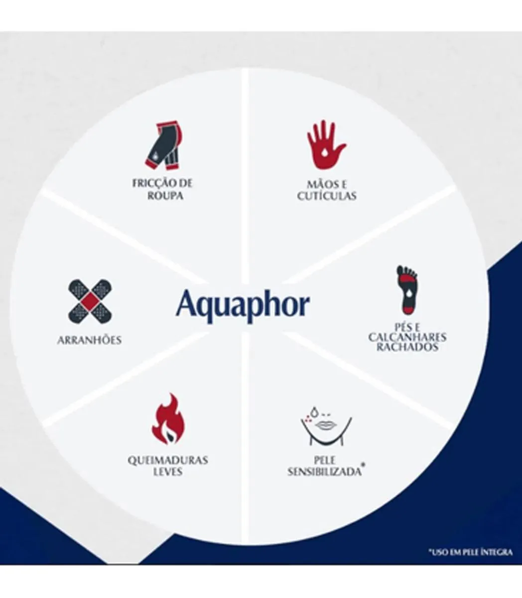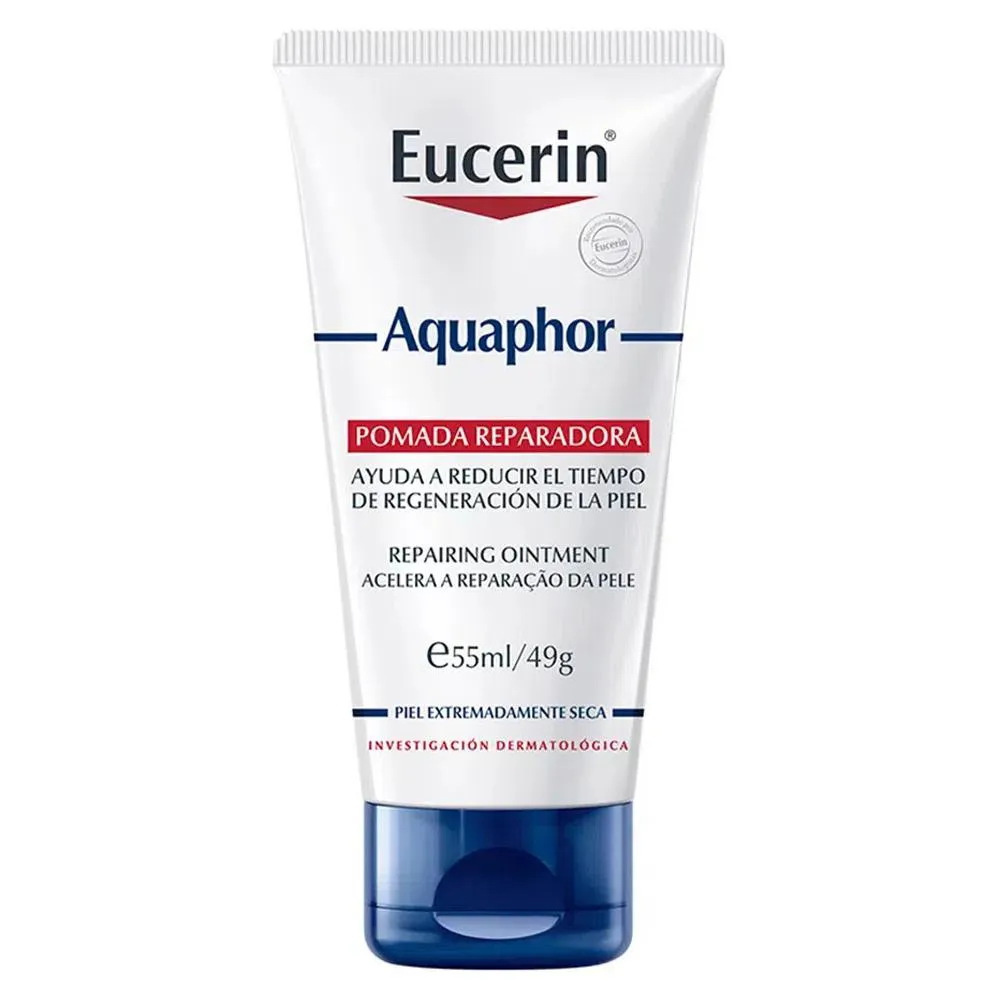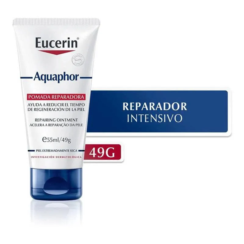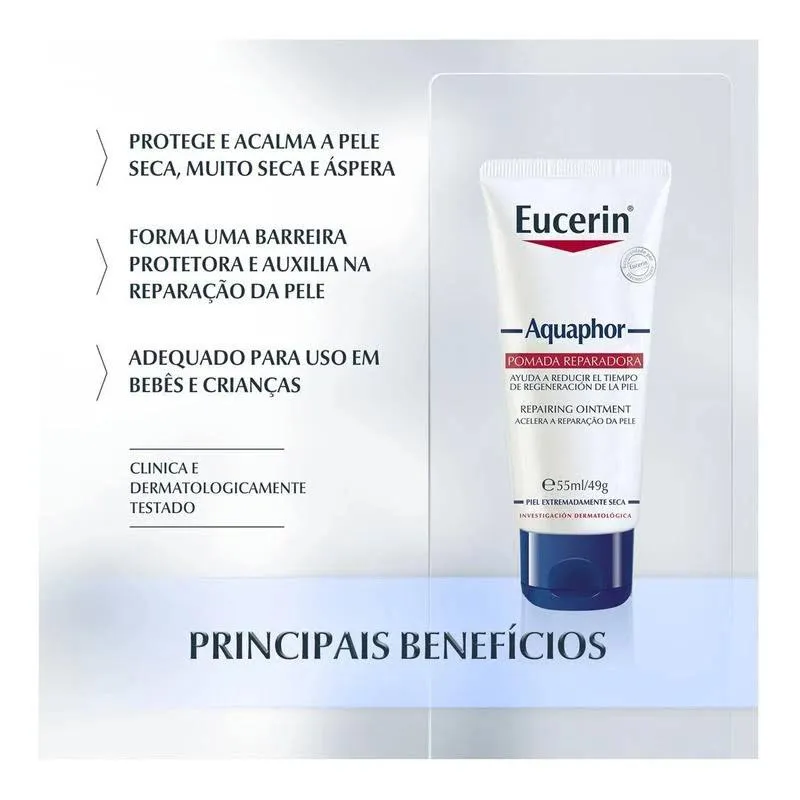 A Pomada Reparadora Eucerin Aquaphor 49g tem a combinação de 7 ativos com ação calmante para alívio imediato, ação reparadora e hidratante. Auxilia na reparação da pele seca/extremamente seca, sua fórmula atua como uma proteção para diversos tipos de necessidades como: queimaduras leves, fricção de roupas, pele sensibilizada, cicatrizes, pele seca, mãos e cutículas ressecadas, assaduras, tatuagem, arranhões, pés e calcanhares ressecados. Aquaphor age formando uma barreira protetora, deixando a pele macia e com aparência saudável.