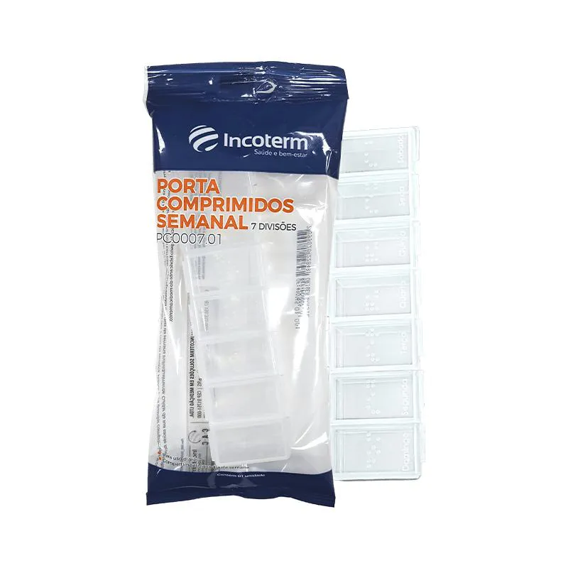 O PORTA COMPRIMIDOS SEMANAL INCOTERM E O PARCEIRO IDEAL PARA QUEM BUSCA UMA ORGANIZACAO EFICIENTE DOS medicamentos AO LONGO DOS 7 DIAS DA SEMANA. COM MARCACOES DISTINTAS PARA CADA DIA, ESTE ORGANIZADOR E PERFEITO PARA ARMAZENAR COMPRIMIDOS E CAPSULAS, FACILITANDO A ORIENTACAO E ADMINISTRACAO DAS MEDICACOES. ALEM DISSO, SUA FUNCIONALIDADE PERMITE O TRANSPORTE INDIVIDUAL DOS COMPRIMIDOS PARA CADA DIA DA SEMANA.