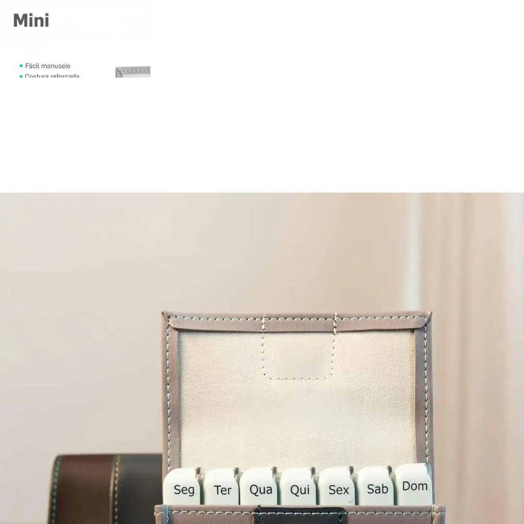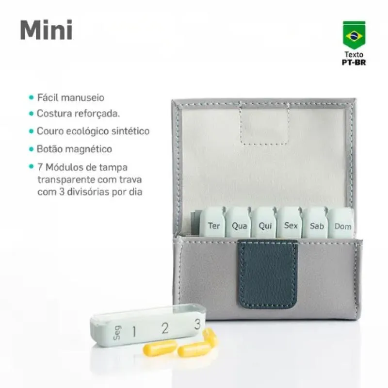 Porta Comprimidos Semanal Mini V4 Cinza – Pilbox O mais compacto! Com um formato pequeno e compacto, cabe em qualquer mala ou bolsa e permite transportar a medicação para uma semana completa. Vantagens: Semanal: 7 módulos grandes independentes, com até 3 tomadas por dia Prático: Permitem ajustar o tamanho das doses e o número diário das doses, de 1 a 3 tomadas Compacto: Pode ser transportado com facilidade para qualquer lugar no dia a dia Fácil de usar: Com fechamento magnético ou por botão pressão: Design: Estojo em couro sintético, discreto e elegante tratamentos: Ideal para tratamentos como colesterol, diabetes, asma, menopausa, tiroide, hipertensão, pílula contraceptiva etc. Ficha de identificação: Ficha de identificação do paciente, medicamentos e tratamento terapêutico prescrito Instruções de uso: Estes compartimentos são delimitados por separadores móveis que podem ser retirados para lhe permitir preparar o seu tratamento em função da posologia. Desta forma, os módulos podem passar de 3 compartimentos a apenas 2 ou 1 compartimento, em função apenas das suas necessidades. 1- As divisórias abrem e fecham ao deslizar a tampa sobre o módulo diário. 2- Para identificar os momentos de tomada do seu tratamento: 1 corresponde à primeira tomada do dia e assim por diante. 3- Para preparar o seu tratamento no organizador de comprimidos, pode retirar as tampas superiores dos módulos. Para tal, puxe e levante a tampa retirando-a. Fique atento ao encaixá-la novamente nos módulos, apenas encaixando do lado correto ela deslizará com facilidade no dia a dia. 4- Os separadores deslocam-se deslizando no módulo. 5- Para retirá-los, incline e puxe. Os medicamentos hidrófilos devem ser conservados no respectivo blíster. Mantenha sempre seu PILBOX® Mini fora do alcance das crianças. SOBRE A LOJA: Somos a rede de farmácias mais antiga de São José dos Pinhais, atuando no ramo farmacêutico desde 1990 com comprometimento à qualidade e satisfação do cliente. É um prazer compartilhar os nossos valores e as nossas conquistas com quem confia no nosso trabalho! Imagens dos Produtos são Meramente Ilustrativas. Todas as Informações Divulgadas são de Responsabilidade Exclusiva do Fabricante/fornecedor.