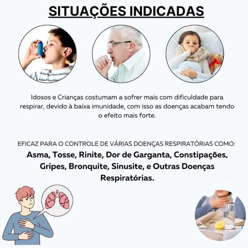 É adequado para crianças e adultos e auxilia no tratamento de doenças respiratórias como asma, bronquite e alergias.