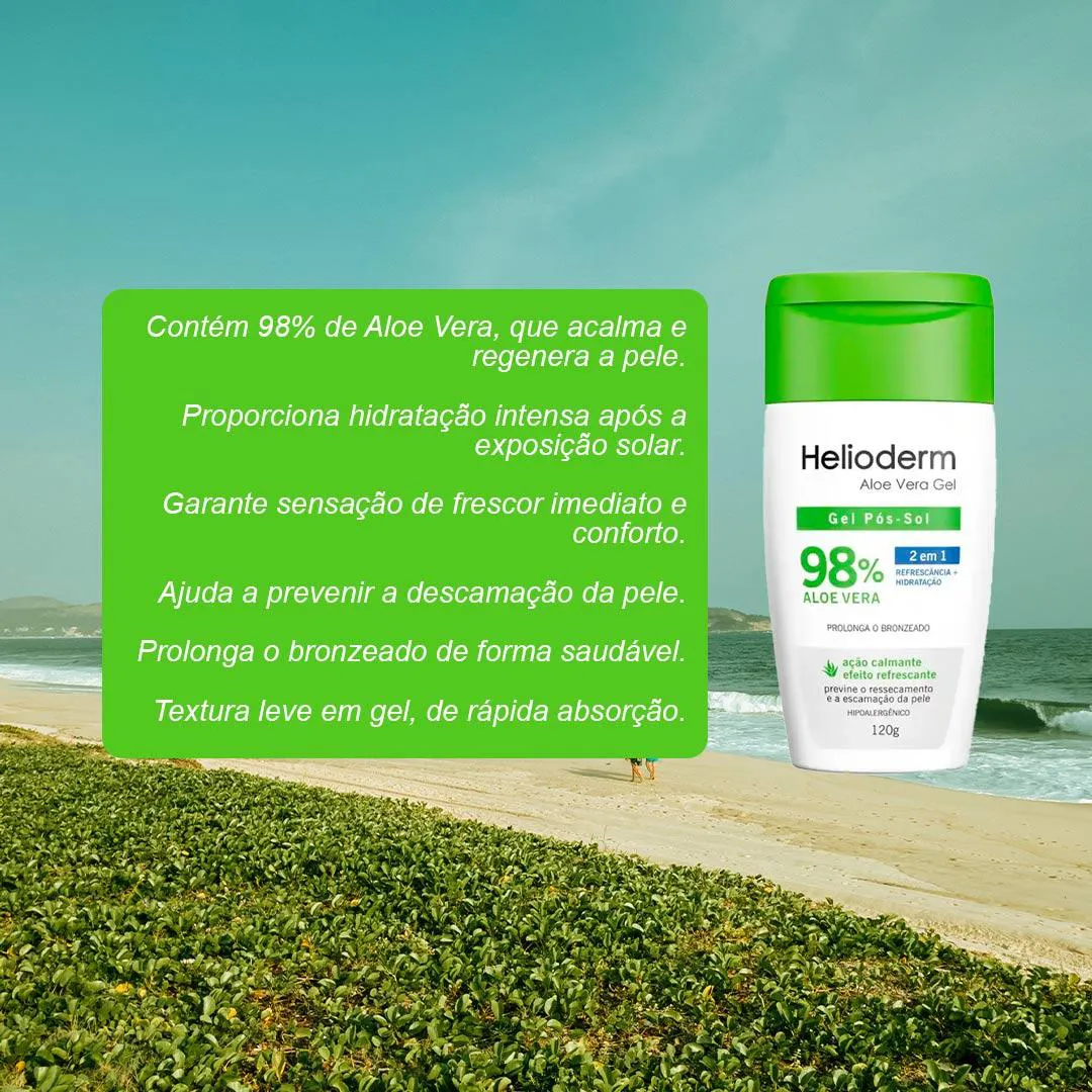 O Helioderm Pós Sol Aloe Vera Gel 98% é um produto dermocosmético desenvolvido para cuidados cutâneos após a exposição solar, com foco em hidratação, refrescância e manutenção da integridade da pele.