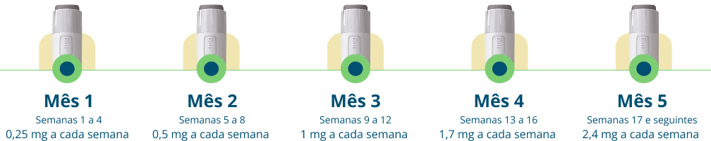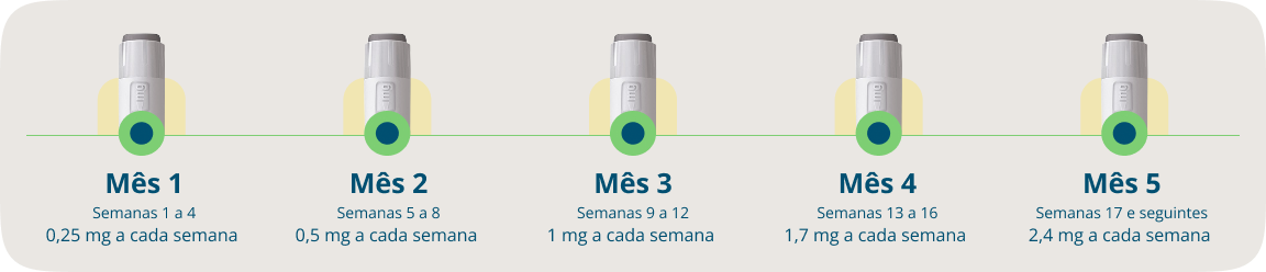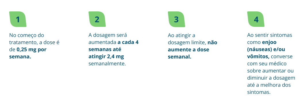Em adultos, é recomendada a dose de 2,4 mg uma vez por semana. O tratamento tem início com uma dose menor, aumentada gradativamente nas 16 semanas seguintes, chegando a 2,4 mg uma vez por semana, conforme orientação médica.