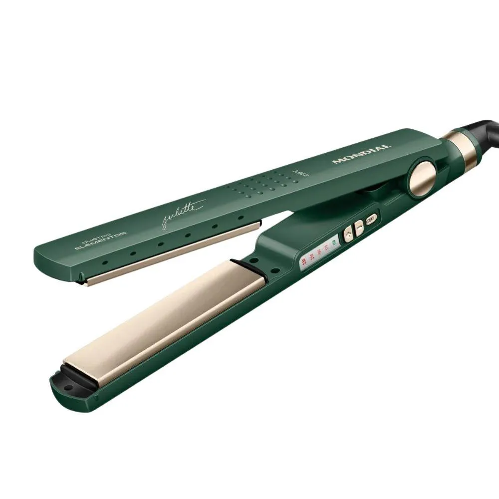 A Prancha Alisadora da Linha by Juliette Quatro Elementos traz um revestimento especial enriquecido com infusao de Ceramica, Titanio, Tourmaline e Nano Silver. Esses 4 elementos, juntos, protegem seus fios e garantem uma aparencia mais saudavel aos cabelos, com brilho intenso, maciez e sem frizz. Saiba mais sobre a Prancha Alisadora P-JU-03: REVESTIMENTO ESPECIAL COM QUATRO ELEMENTOS Ceramica: Garante uma melhor distribuicao do calor e contribui para uma secagem rapida e mais saudavel. Titanio: Tecnologia que age na umidade dos cabelos e reduz o tempo de secagem, alem de eliminar o efeito frizz. Tourmaline: Fonte natural de ions negativos, que eliminam o frizz e garantem mais brilho. Nano Silver: Particulas de prata que ajudam a inibir a acao de bacterias, contribuindo para a protecao dos fios e do couro cabeludo. - PAINEL DIGITAL COM CONTROLE DE TEMPERATURA: Sao 5 opcoes de 1500C a 2300C, para um alisamento perfeito e adequado aos diferentes tipos de cabelo. - AQUECIMENTO RAPIDO: Ate 4500F | 2300C: Aquece rapidamente e mantem a temperatura estavel durante o uso. - BIVOLT: Pode ser utilizada em ambas as voltagens: 127V e 220V. Liberdade de usar sua prancha em qualquer lugar! - CABO GIRATORIO DE 2,5 METROS: O cabo-plugue tem 2,5 metros de comprimento e gira 3600, garantindo mais autonomia de movimento. - UM ANO DE GARANTIA MONDIAL: A Mondial e a escolha de milhoes de consumidores. Mondial, a escolha inteligente! Especificacoes Tecnicas: Marca: Mondial Modelo: P-JU-02 Cor: Verde Oliva Voltagem (Tensao): Bivolt Itens inclusos: 01 Prancha Alisadora e 01 Manual de Instrucoes Controle de temperatura: Sim Niveis de temperaturas: de 150 ate 230 C Visor: Sim Cabo giratorio: Sim Tecnologias (emite ions): Sim Funcoes: Alisar e Modelar Revestimento: Ceramico, Titanio, Tourmaline e Nano Silver Trava de seguranca: Sim Comprimento do cabo: 2,5m Peso: 0,390kg Garantia: 12 meses
