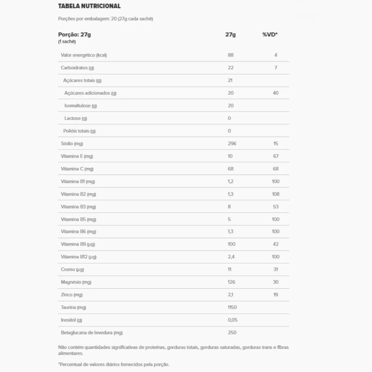 A composição inclui palatinose, maltodextrina, extratos de guaraná e chá verde, vitaminas do complexo B, minerais e adoçantes naturais, sem açúcar, glúten ou lactose.