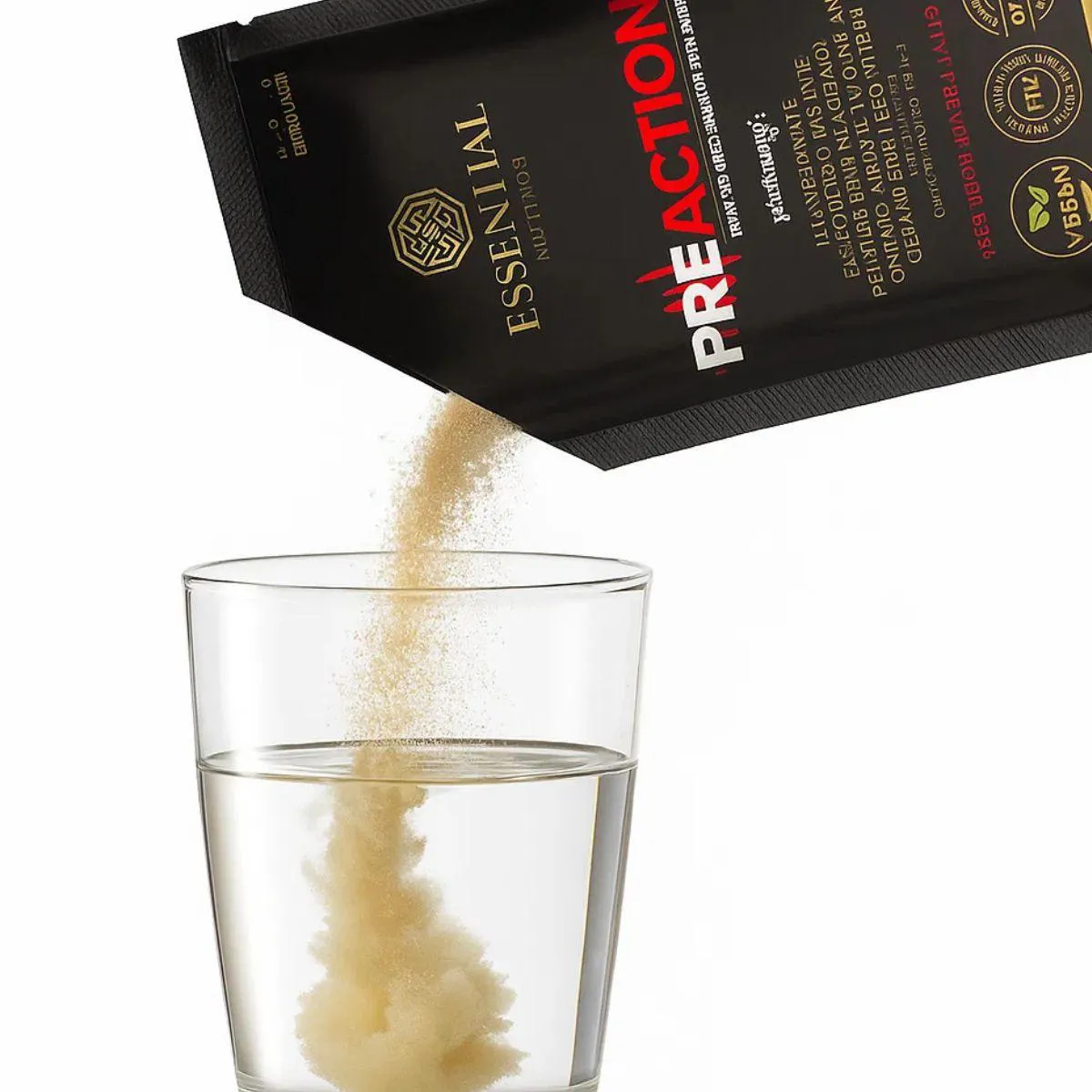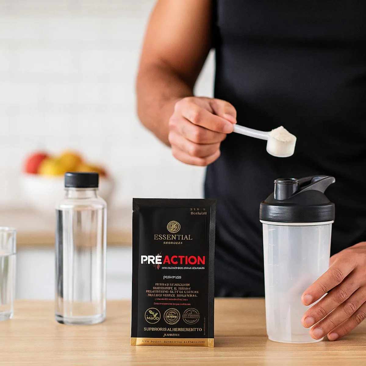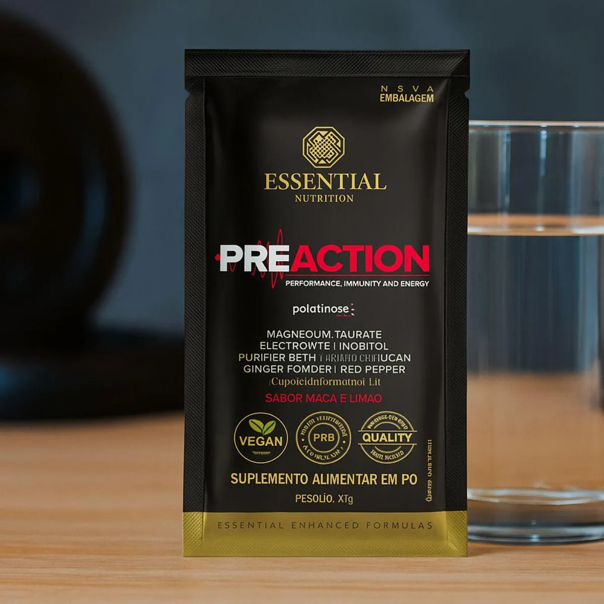 Pre-Action Energy Drink da Essential Nutrition apresenta 20 sachês de 27 g, totalizando 540 g, formulados para fornecer bebida energética antes de atividades. Combina carboidratos, cafeína natural e eletrólitos.