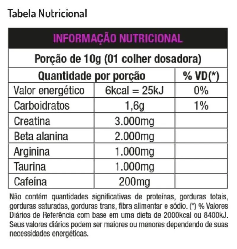 - Formulação a base de creatina, beta alanina, arginina, taurina e cafeína;