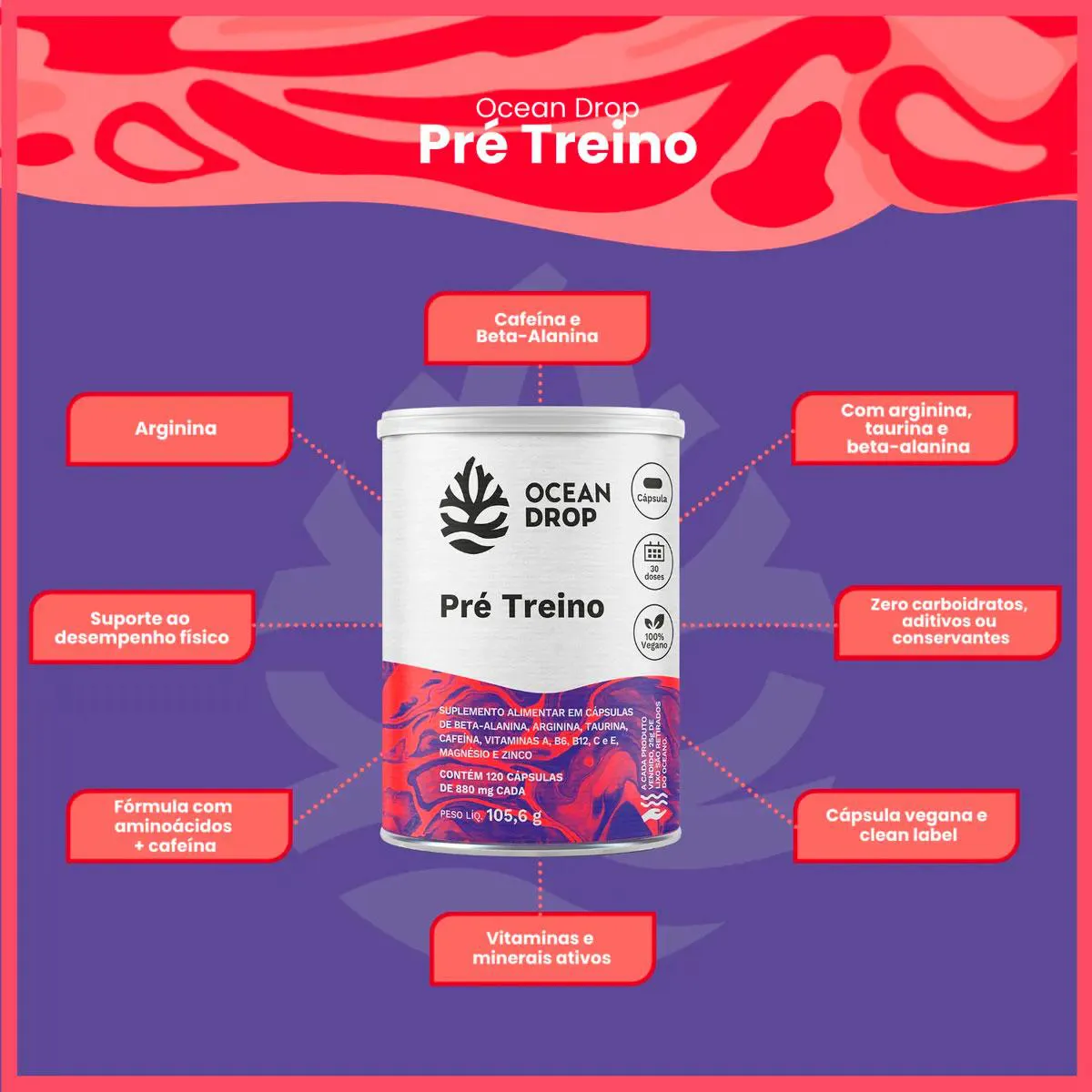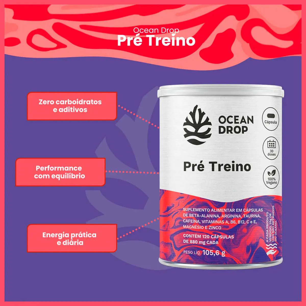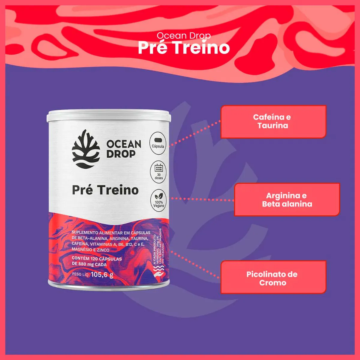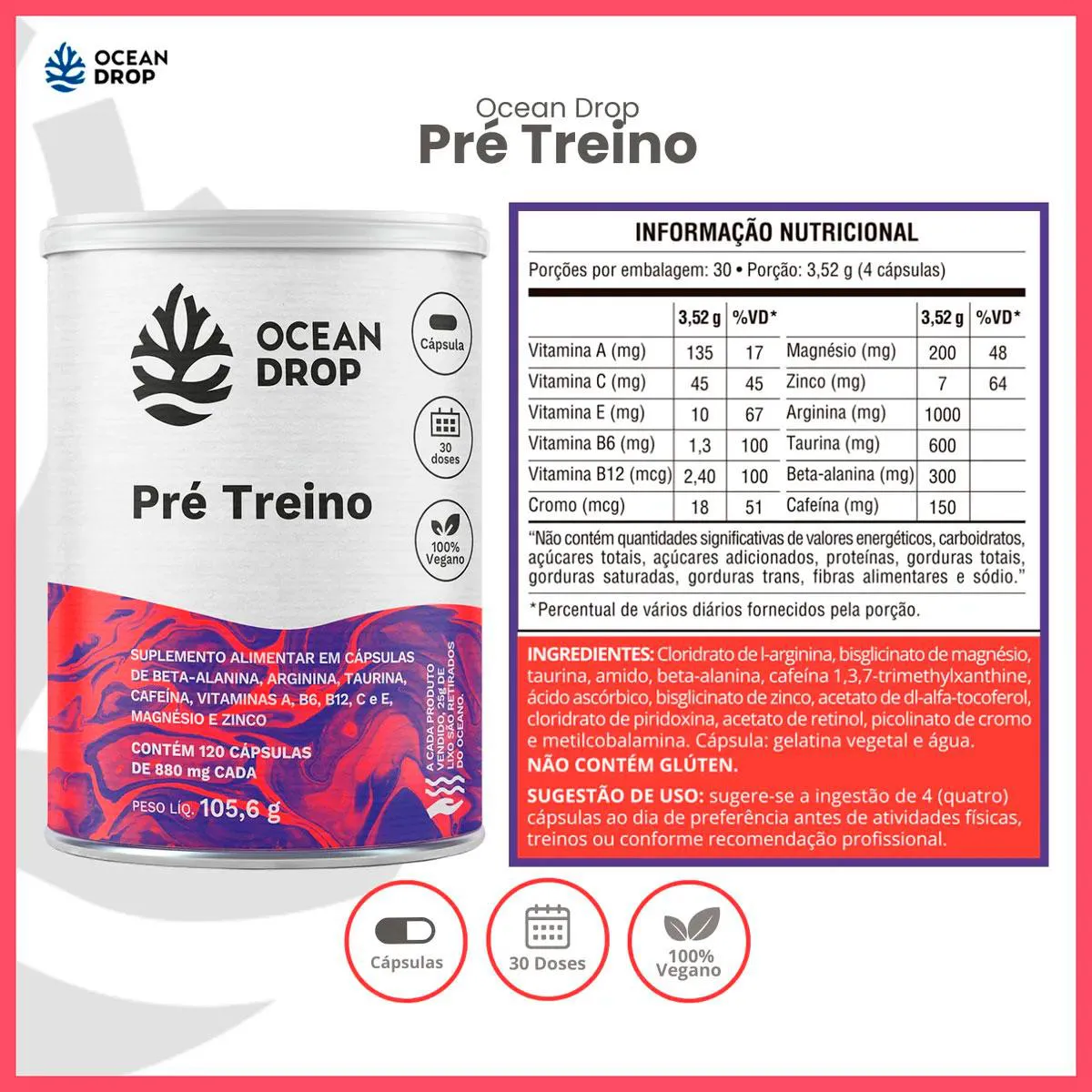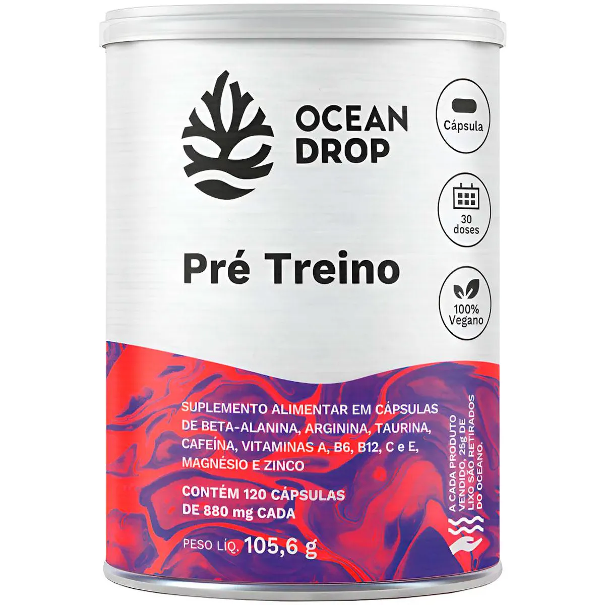 Destaques da Fórmula do pré treino Ocean Drop 1000mg de Arginina por porção 600mg de Taurina por porção 300mg de Beta-Alanina por porção 150mg de Cafeína por porção Vitaminas A, C, E, B6 e B12 + Zinco, Magnésio e Cromo Clean Label: cápsula vegetal, sem glúten, sem aditivos Ingredientes do Pré Treino Ocean Drop Arginina, taurina, beta-alanina, cafeína, vitaminas A, C, E, B6 e B12, picolinato de cromo, bisglicinato de magnésio, zinco, cápsula vegetal. Sugestão de Consumo Sugere-se a ingestão de 4 cápsulas ao dia ou conforme recomendação profissional. Ingerir com líquido, preferencialmente de 30 a 15 minutos antes do treino. Conservação Conservar ao abrigo da luz, calor e umidade. Após aberto, manter a embalagem bem fechada. Informações importantes ESTE PRODUTO NÃO É UM MEDICAMENTO NÃO EXCEDA A DOSE RECOMENDADA MANTENHA LONGE DO ALCANCE DAS CRIANÇAS ANVISA: Produto dispensado de Registro conforme RDC 27/2010
