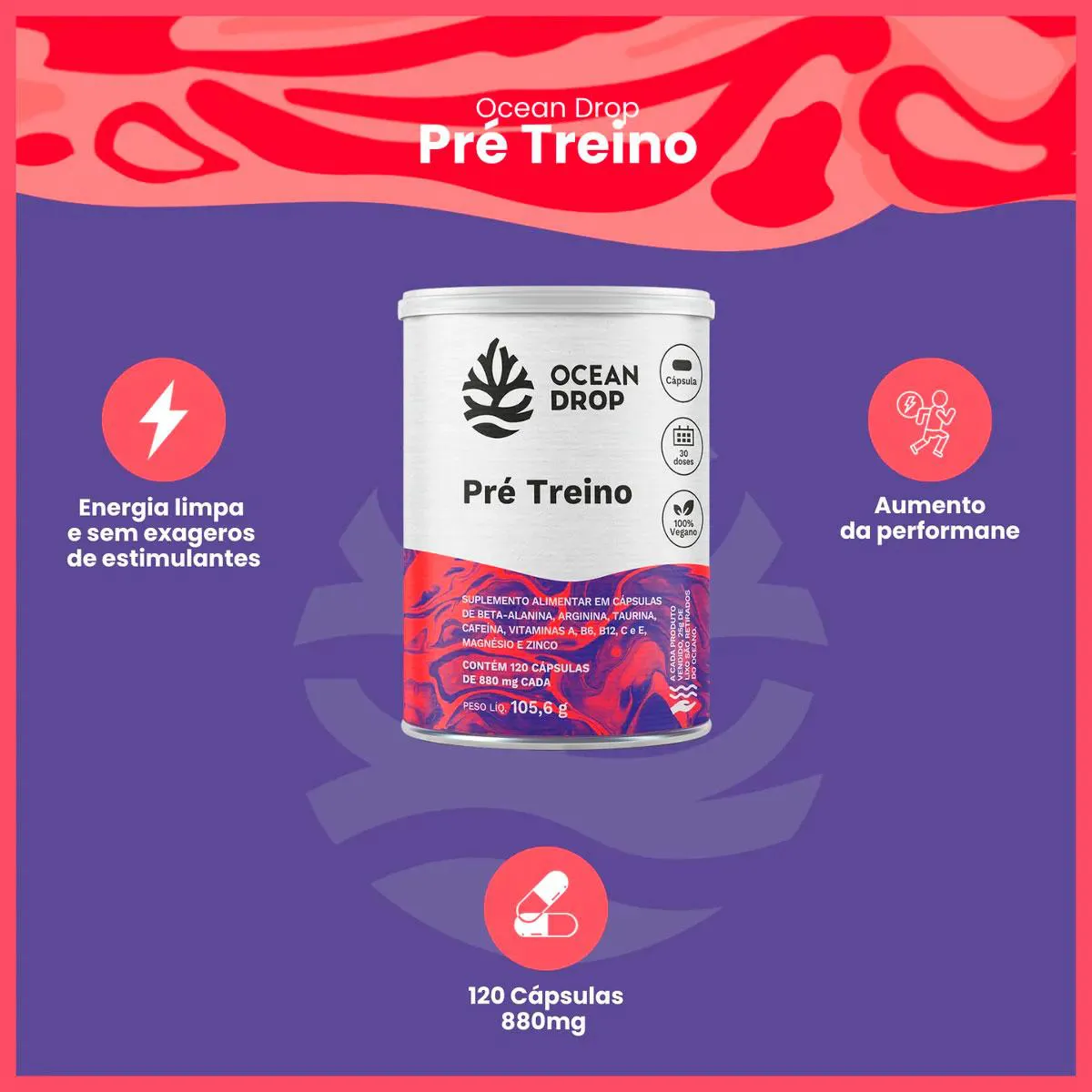 Pré Treino em Capsula Vegano (120 Capsulas) Ocean Drop