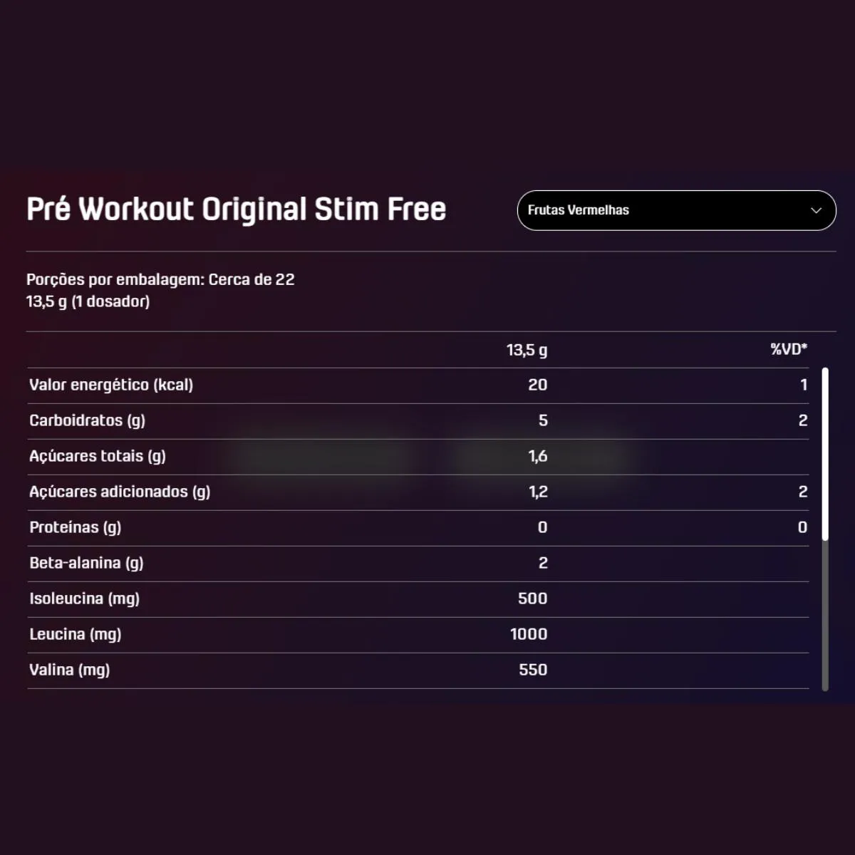 Pre Workout Stim Free DUX Human Health é um pré-treino inovador e livre de estimulantes. Desenvolvido para quem deseja performance máxima, energia e foco a qualquer hora do dia, sem interferir no sono ou causar desconfortos associados à cafeína. Pre Workout Stim Free DUX Human Health foi desenvolvido para oferecer energia e foco sem cafeína. Entre os ingredientes principais está a taurina, que apoia a resistência e a recuperação muscular, além de favorecer a saúde cardiovascular e ajudando a manter o foco durante o treino. Com BCAAs para síntese de proteínas e redução da fadiga, beta-alanina para aumentar a resistência muscular, e água de coco para hidratação e reposição de eletrólitos, a fórmula é completa. O complexo de vitaminas B também contribui, ajudando o metabolismo energético e o suporte ao sistema nervoso, mantendo você com energia e concentração. Ingredientes: Beta-alanina, L-Arginina, água de coco em pó, taurina, mix de vitaminas (dextrose, niacinamida (vitamina B3), riboflavina (vitamina B2), tiamina mononitrato (vitamina B1), ácido fólico (vitamina B9), D-biotina e cianocobalamina (vitamina B12)), L-Leucina, L-Valina, L-Isoleucina, regulador de acidez ácido cítrico, aromatizantes, antiumectante fosfato tricálcico, corante carmins e edulcorante sucralose. ALERGICOS: PODE CONTER TRIGO, AVEIA, AMENDOIM, SOJA, LEITE, AMÊNDOA, AVELÃS, CASTANHA-DE-CAJU E PISTACHES. CONTÉM GLÚTEN. Sugestão de uso: Adicione uma porção de 1 dosador (13,5g) em 250 ml de água. Consumir doses de 35 ml ao longo do dia, com intervalo de 2 horas entre as doses ou conforme orientação médica. Pode ser consumido a qualquer hora do dia.