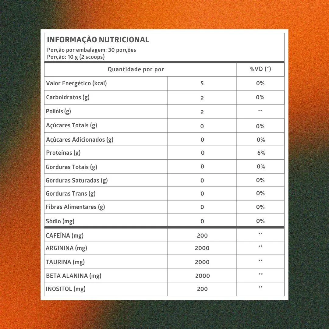 • Sugestão:Adicione 10g do seu novo Pré-Treino favorito em 200ml de água gelada e consuma 20 minutos antes do treino ou conforme indicação do seu médico ou nutricionista.Intervalo de 2 horas entre doses.