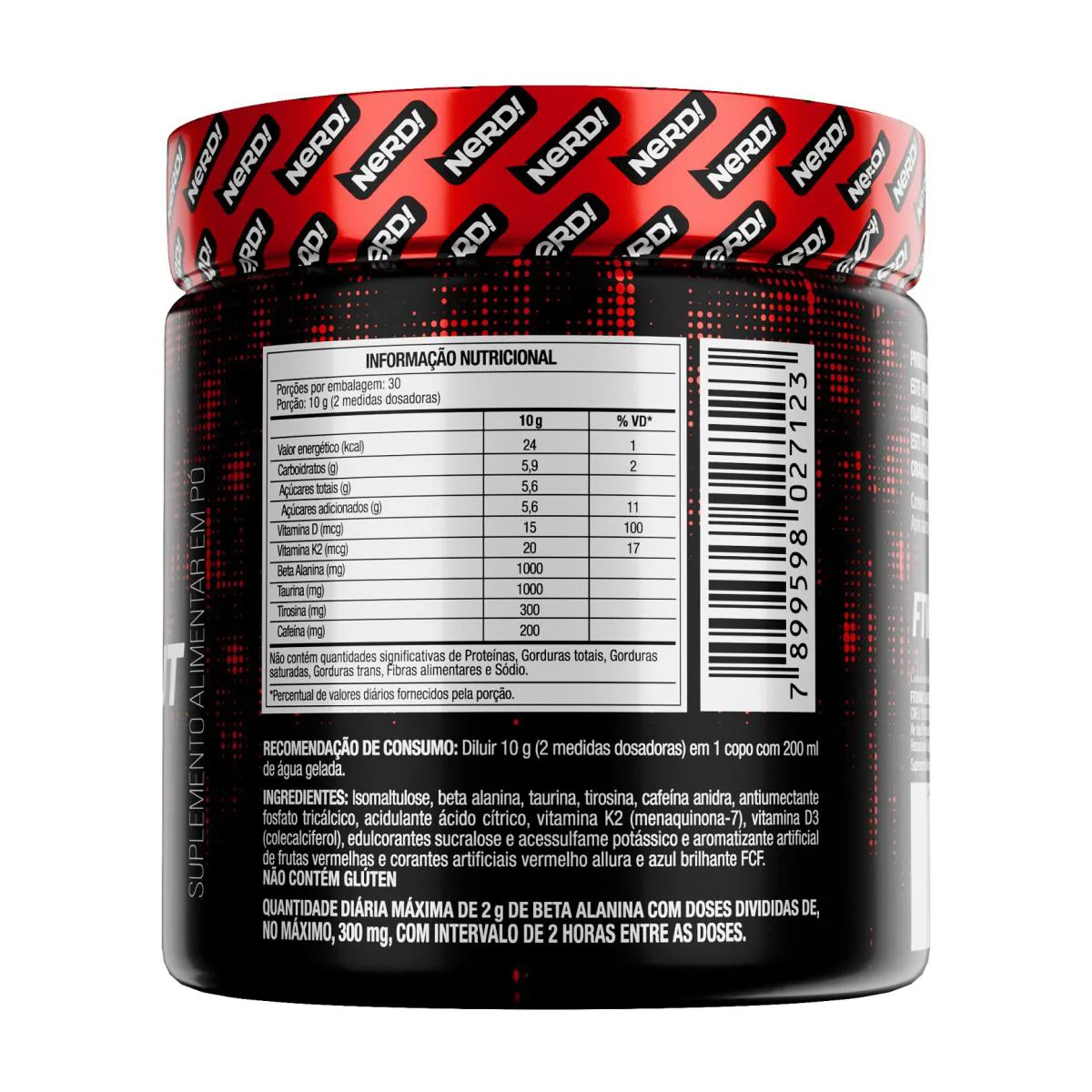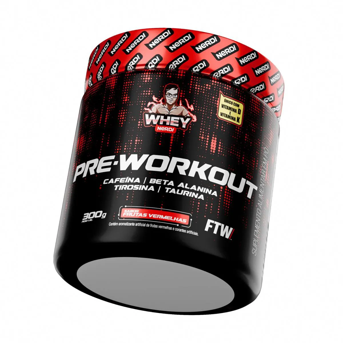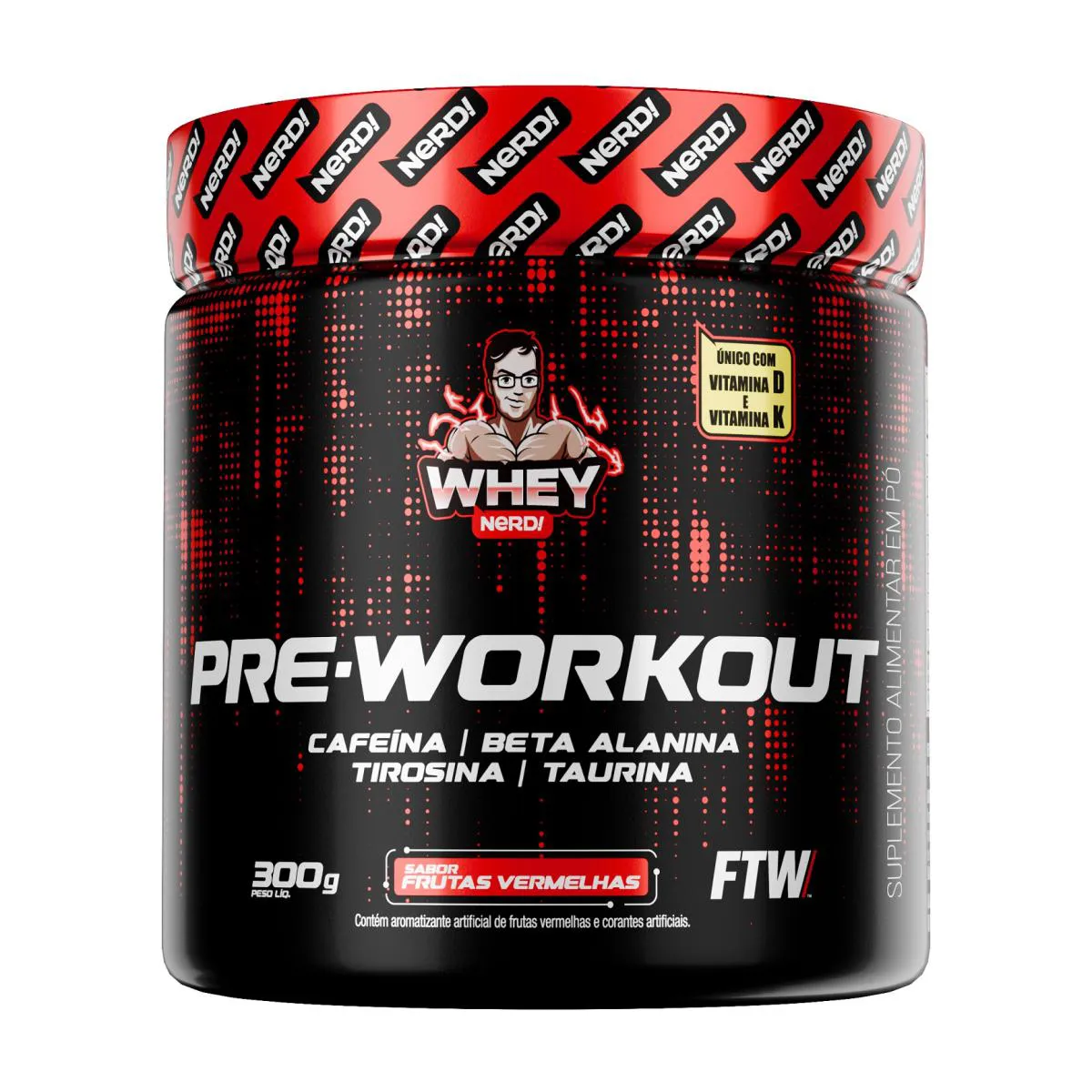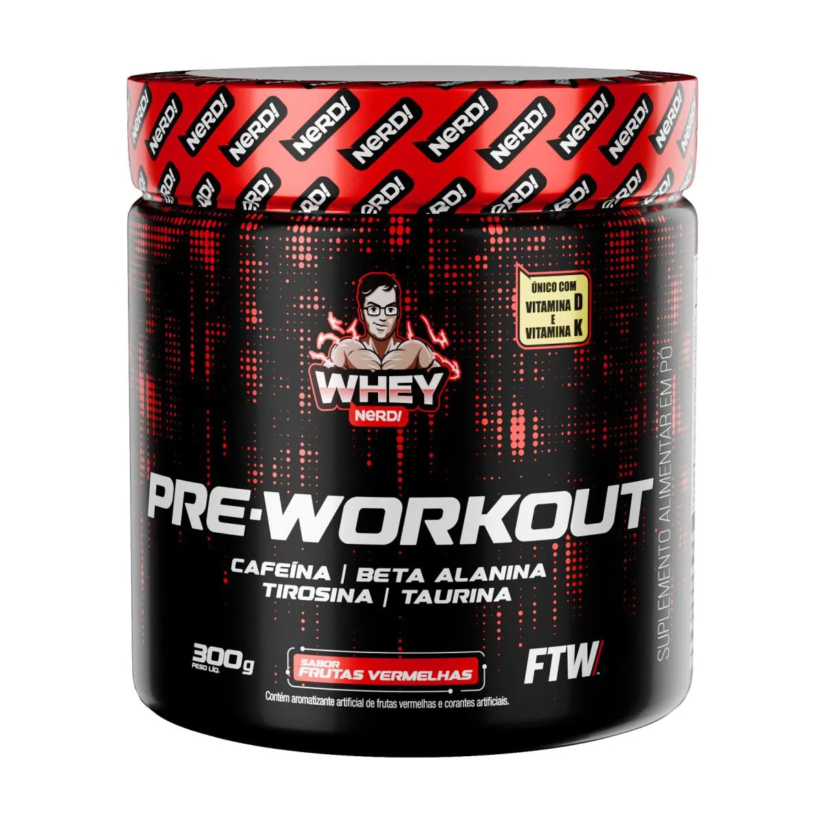 Pre-Workout 300g - Whey NerdO que é / Para que servePre-Workout Whey Nerd é um suplemento alimentar em pó indicado para adultos que desejam complementar sua ingestão de cafeína, aminoácidos e vitaminas. Desenvolvido com ingredientes como beta-alanina, taurina, tirosina, arginina e cafeína microencapsulada.Recomendado para consumo prévio à atividade física, conforme as necessidades individuais e dentro de uma rotina alimentar equilibrada, sob orientação de profissional da saúde.IngredientesIsomaltulose, Beta-alanina, L-arginina, L-taurina, L-tirosina, cafeína microencapsulada, antiumectante fosfato tricálcico, acidulante ácido cítrico, vitamina K2, vitamina D3, edulcorantes sucralose e acessulfame de potássio, corante e aromatizante.