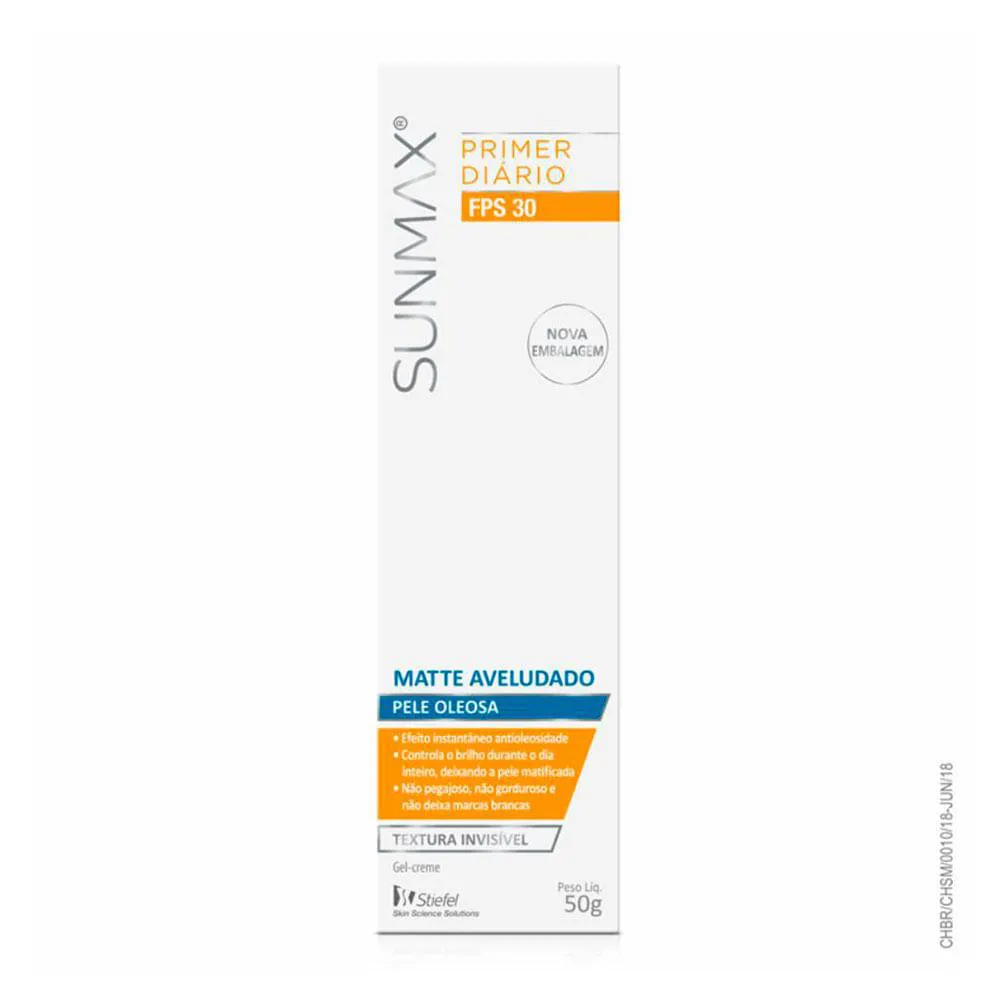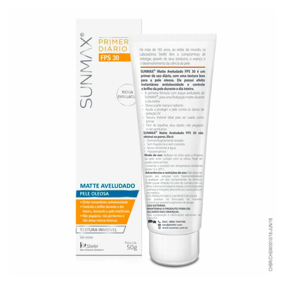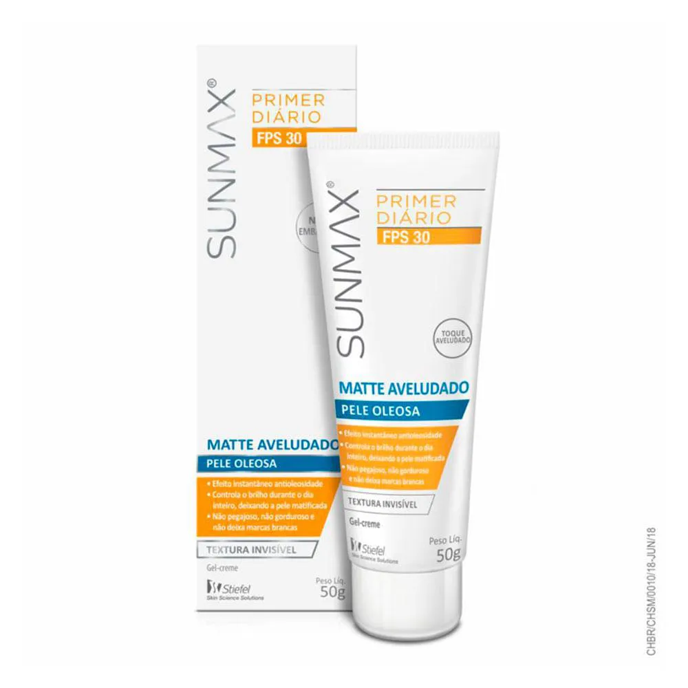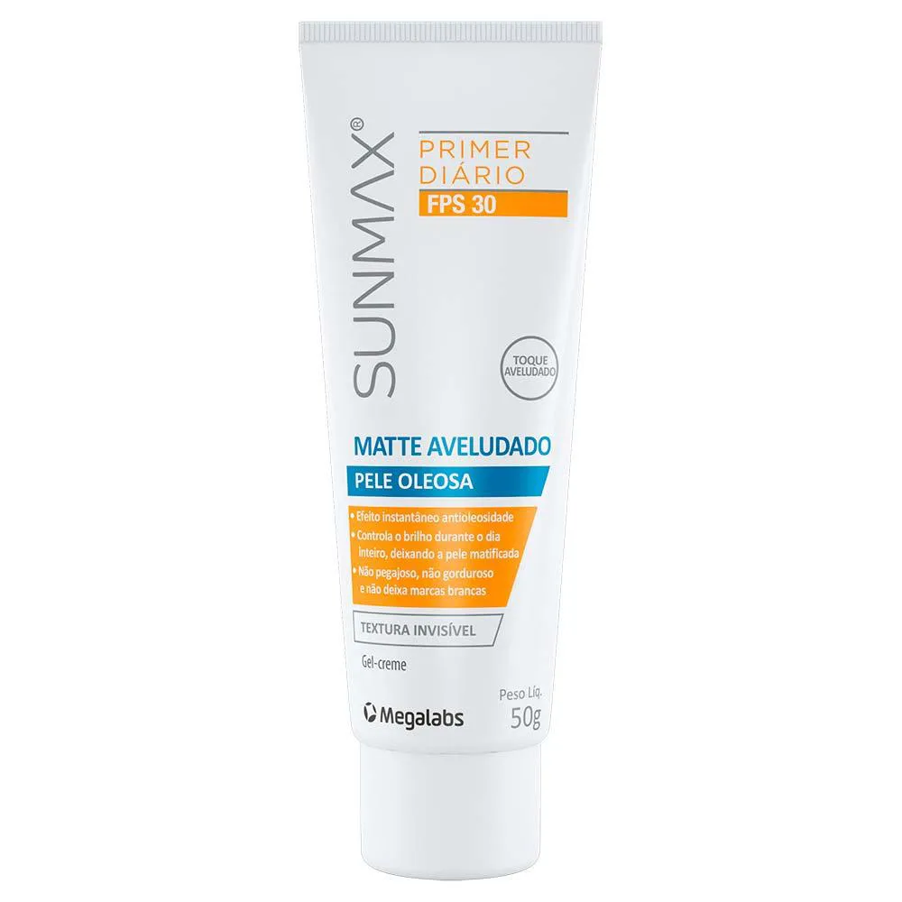 Primer diário antioleosidade com FPS 30 e controle de brilho o dia todo. SunMax Matte Aveludado FPS 30 possui textura invisivel e acabamento matte com toque aveludado. Não obstrui os poros e é muito resistente à água.