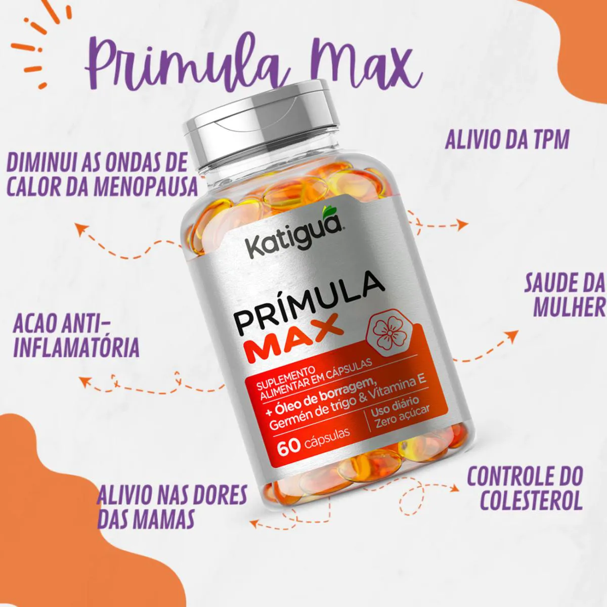 O Prímula Max Katiguá é um suplemento alimentar que contém óleo de prímula, fonte natural de ácido gama-linolênico (GLA), um tipo de gordura essencial que auxilia no equilíbrio nutricional.