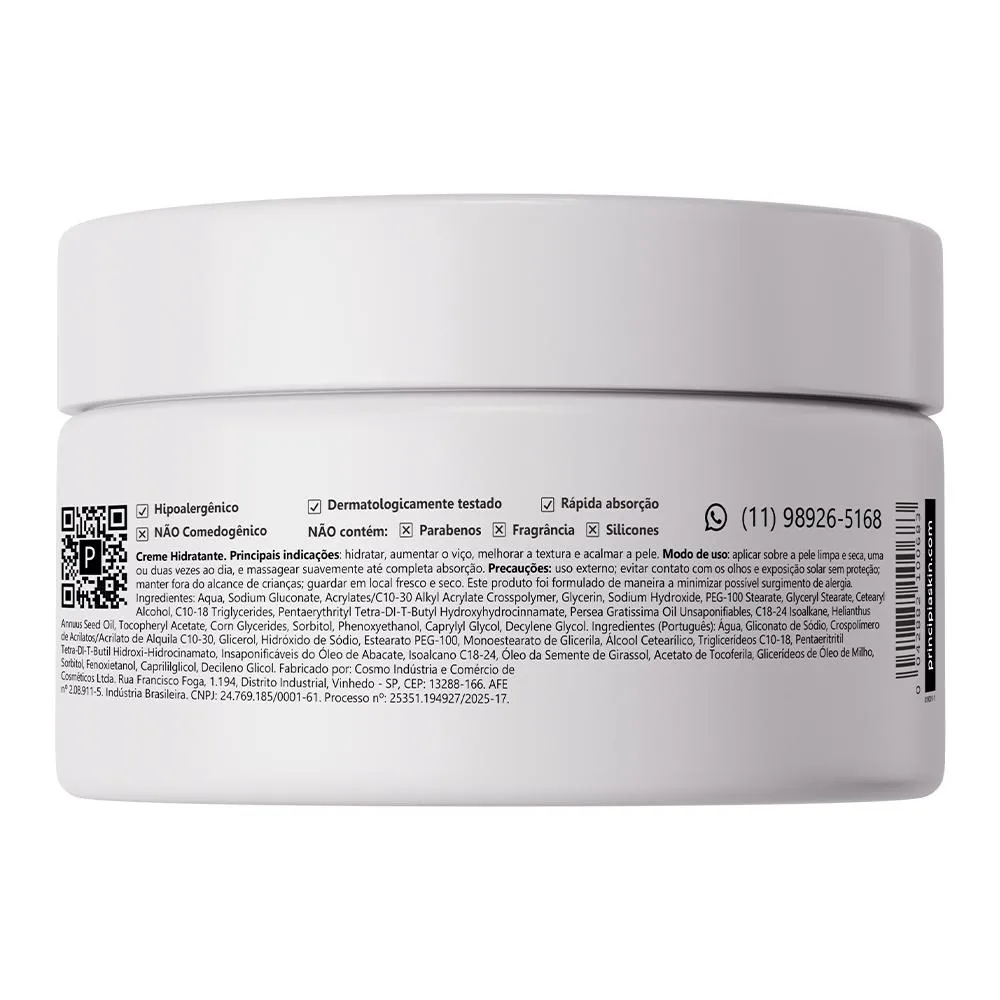 Creme Hidratante com 5% de óleo de semente de girassol, 5% de glicerina e 3% de manteiga de abacate para hidratação intensa e prolongada, aumento do viço, melhora na textura e acalmar a pele.