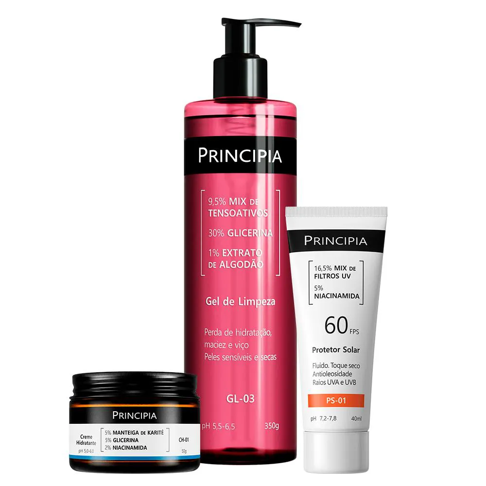 Kit com três produtos para cuidados diários para pele seca: Gel de limpeza com 9,5% de mix de tensoativos, 30% de glicerina e 1% de extrato de algodão, melhora da hidratação, maciez e viço. Indicado para peles sensíveis e secas, reme hidratante com 5% de manteiga de karité, 5% de glicerina e 2% de niacinamida com alta eficácia na melhora do viço, elasticidade, firmeza e hidratação da pele e um protetor solar fluido antioleosidade com 16,5% de filtros UV e 5% de niacinamida, FPS 60, toque seco e eficácia contra raios UVA e UVB.