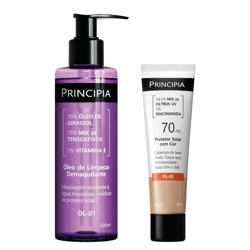 Kit com dois produtos para cuidados da pele: óleo de limpeza demaquilante com 30% de óleo de girassol, 15% mix de tensoativos e 1% vitamina e, e um protetor solar com cor, cobertura de base, fluido, antioleosidade com 14,5% de filtros UV e 5% de niacinamida, FPS 70, toque seco e eficácia contra raios UVA e UVB.