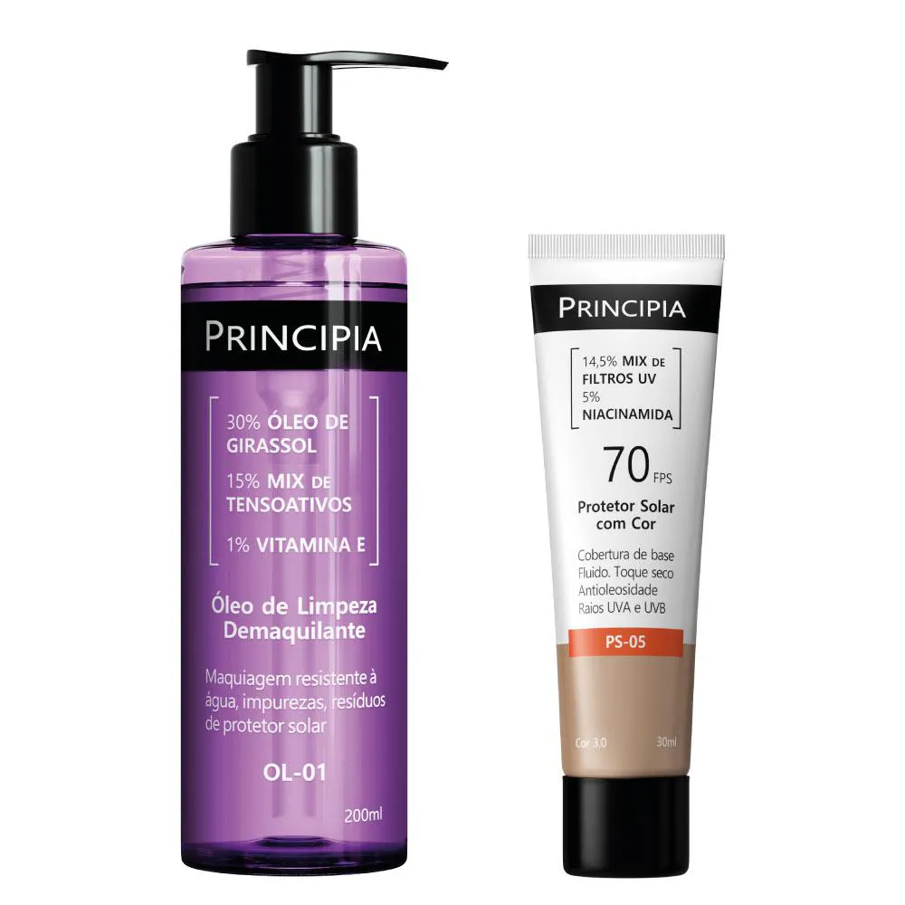 Kit com dois produtos para cuidados da pele: óleo de limpeza demaquilante com 30% de óleo de girassol, 15% mix de tensoativos e 1% vitamina e, e um protetor solar com cor, cobertura de base, fluido, antioleosidade com 14,5% de filtros UV e 5% de niacinamida, FPS 70, toque seco e eficácia contra raios UVA e UVB.