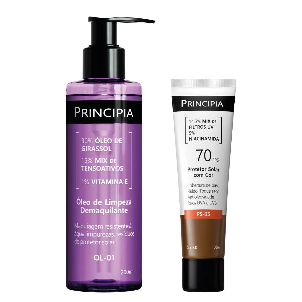 Kit com dois produtos para cuidados da pele: óleo de limpeza demaquilante com 30% de óleo de girassol, 15% mix de tensoativos e 1% vitamina e, e um protetor solar com cor, cobertura de base, fluido, antioleosidade com 14,5% de filtros UV e 5% de niacinamida, FPS 70, toque seco e eficácia contra raios UVA e UVB.