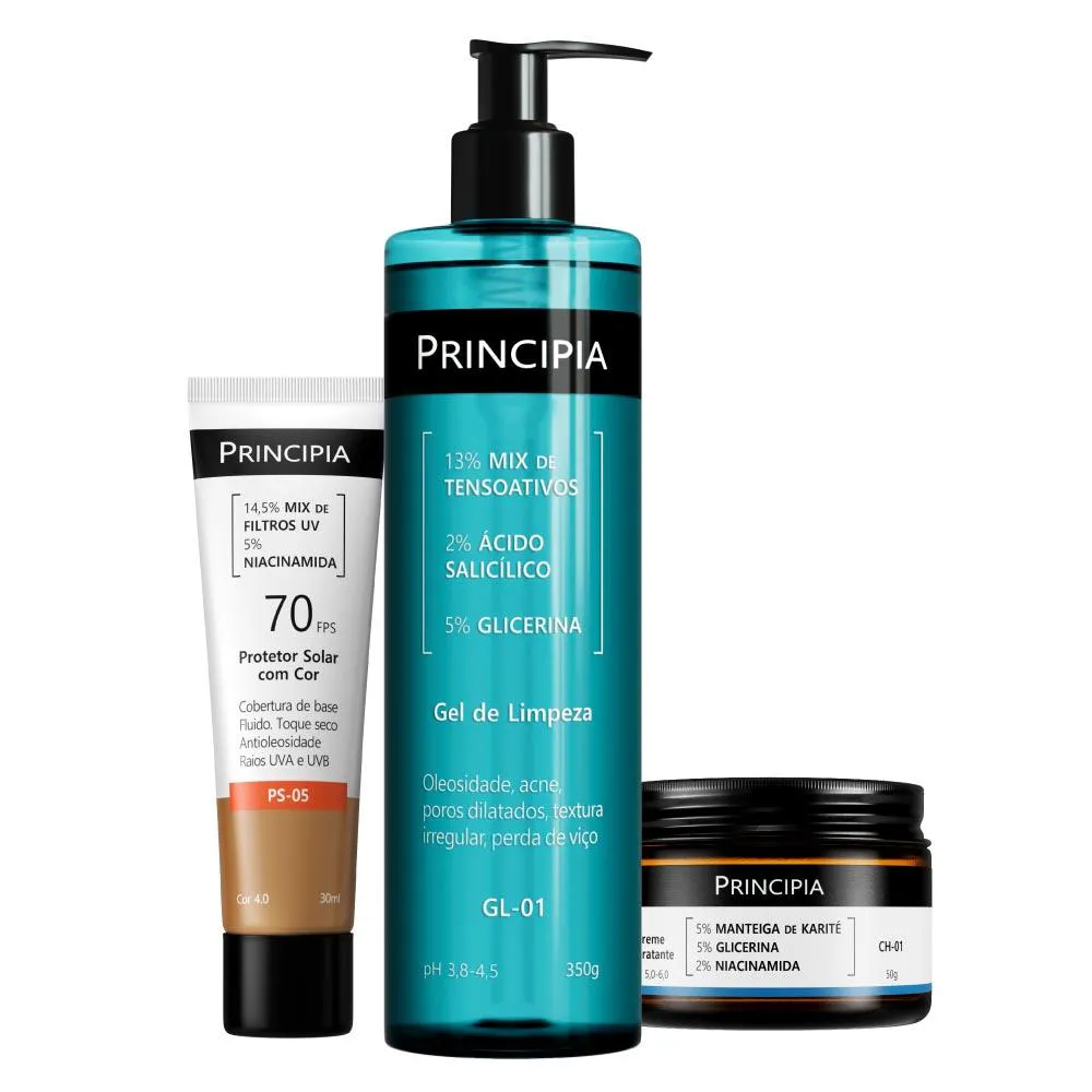 Kit com três produtos para cuidados da pele: um creme hidratante com 5% de manteiga de karité, 5% de glicerina e 2% de niacinamida, um gel de limpeza com 2% de ácido salicílico e 5% de glicerina e um protetor solar com cor, cobertura de base, fluido, antioleosidade com 14,5% de filtros UV e 5% de niacinamida, FPS 70, toque seco e eficácia contra raios UVA e UVB.