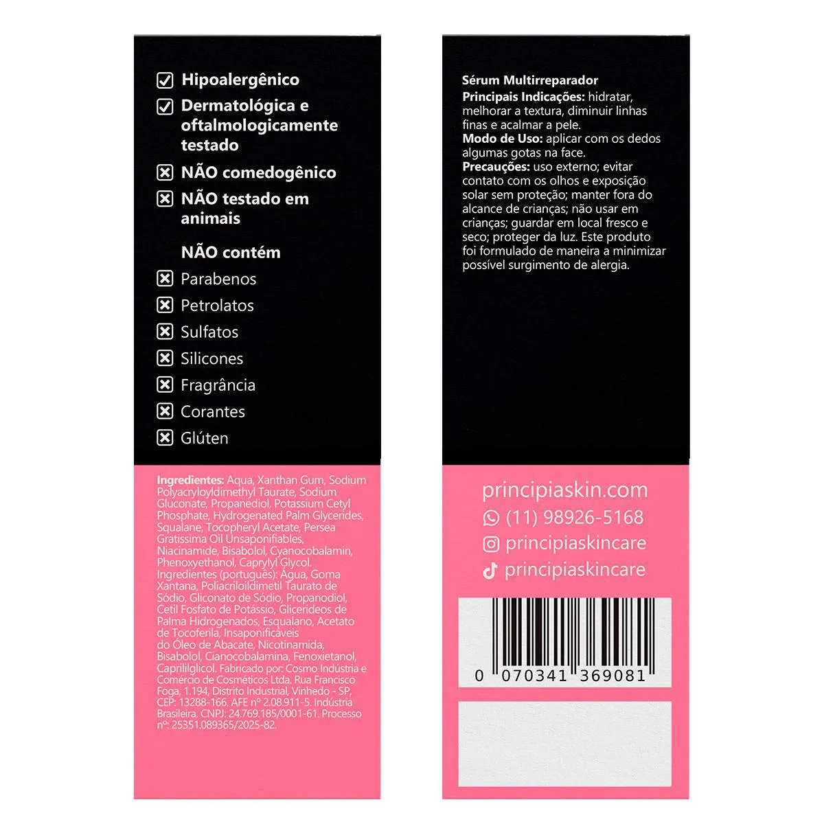 Contém parabenos, petrolatos e sulfatos?Não. Sua composição também não inclui silicones, fragrância, corantes e nem glúten. Contém sulfato. Está regularizada na Anvisa?Sim, conforme o processo número 25351.842514/2023-81, 25351.089365/2025-82 e 25351.803838/2023-01. Foi testada em animais?Não. A PRINCIPIA não realiza testes em animais. Qual o prazo de validade?Três anos, contados da data de fabricação. Pode ser usada junto com outras fórmulas?Sim. Praticamente não há restrições para uso conjunto com outros ativos. Pode ser aplicada na área do olhos?Sim. Sua segurança e eficácia foram comprovadas também para a área dos olhos. Causa acnes ou cravos?Não. Pelo contrário, costuma ter efeito benéfico e ser recomendada para peles acnêicas.