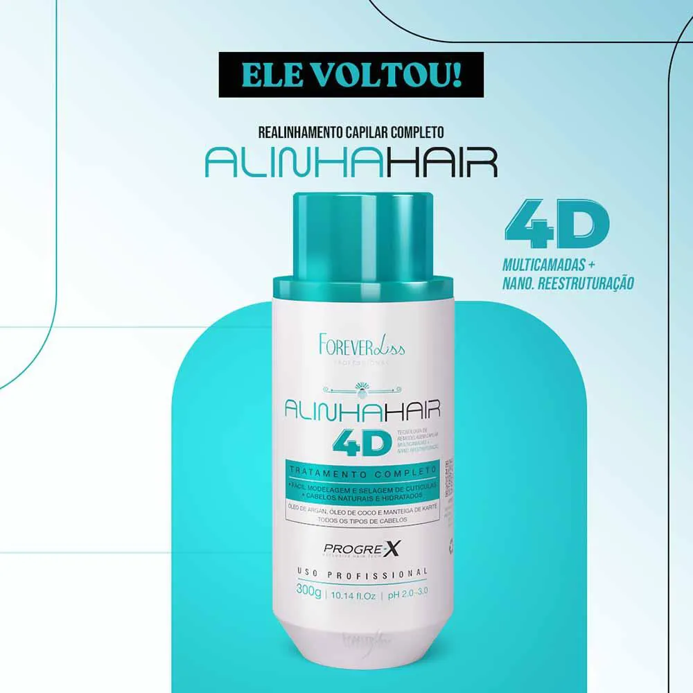 AlinharHair 4D Realinhamento Capilar Forever Liss 1000g com nano.reestruturação, promove máxima redução de volume e alinhamento completo dos fios. Ainda mais poderosa com ativos naturais como óleo de coco, óleo de Argan e Manteiga de Karité e Tecnologia 4D que proporciona remodelagem dos fios para um alinhamento capilar completo e duradouro, reforço da fibra capilar e disciplina aos fios, dando brilho, maciez e movimento incríveis aos cabelos. Age na reconstrução da fibra capilar, através da ação escova e calor da prancha.