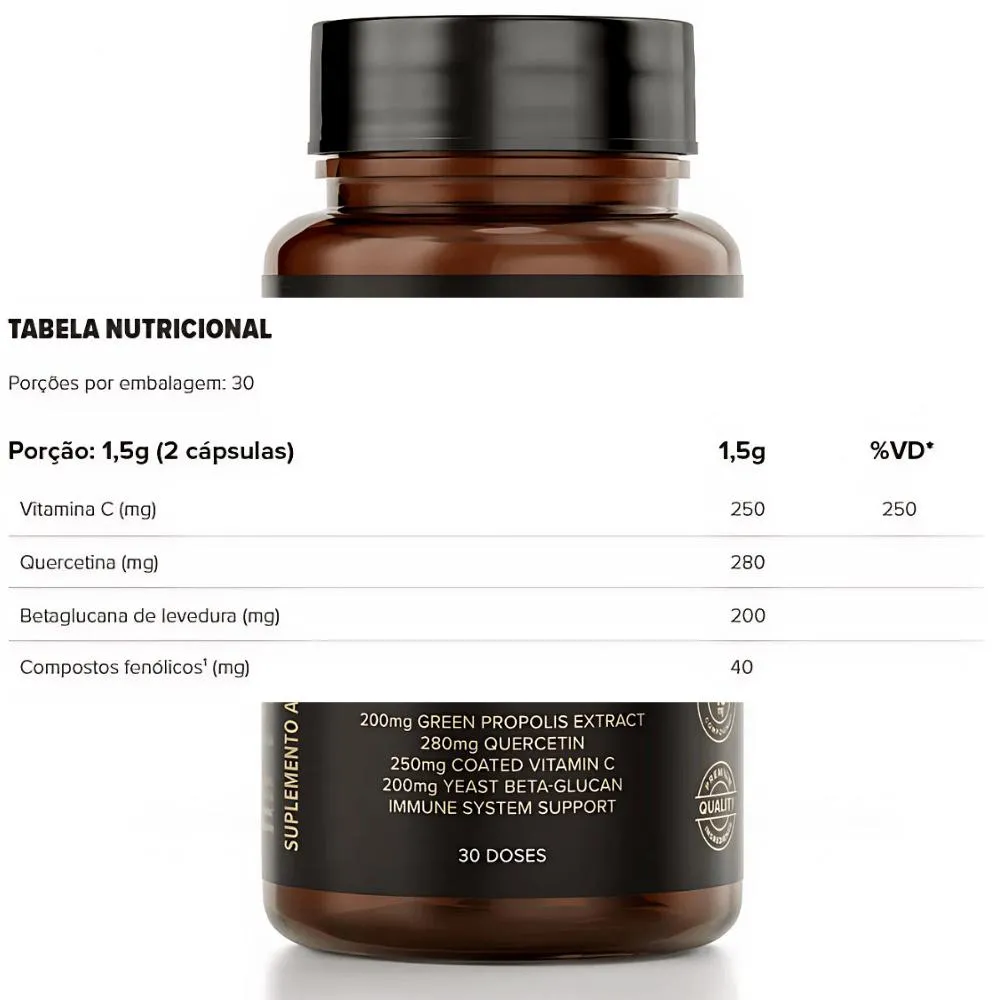 Quercetina, vitamina C revestida (ácido ascórbico revestido), extrato de própolis verde, betaglucana de levedura, triglicerídeos de cadeia média em pó, celulose microcristalina e dióxido de silício. Cápsula vegetal com espessantes e corante inorgânico dióxido de titânio. Não contém glúten. Modo de uso e conservação